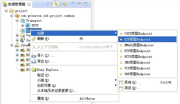 1. 在资源管理器中,选中新建的公共Module中的"Endpoint",点击右键,选择"创建->EJB类型Endpoint"菜单项,创建EJBEndpoint,如下图所示。