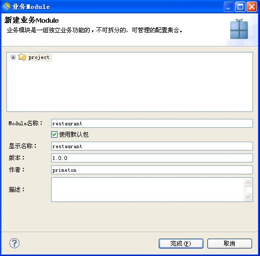2. 在"业务Module"向导中,输入业务Module的相关信息,点击"完成"按钮,创建业务Module,如下图所示。