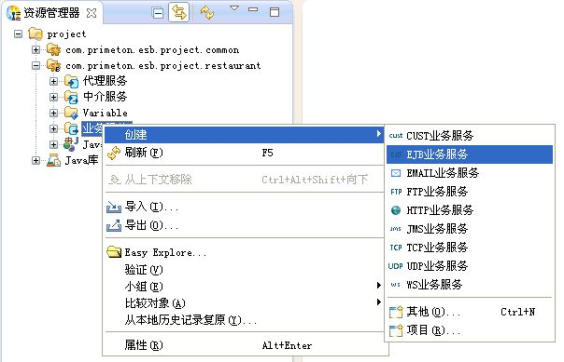 1. 在资源管理器中,选中新建的业务Module中的"业务服务",点击右键,选择"创建->EJB业务服务"菜单项,创建EJB业务服务,如下图所示。