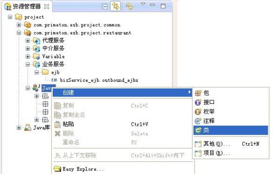1. 创建Java方法。在资源管理器中右键点击业务Module中的Java,选择"创建->类" 菜单项,如下图所示。