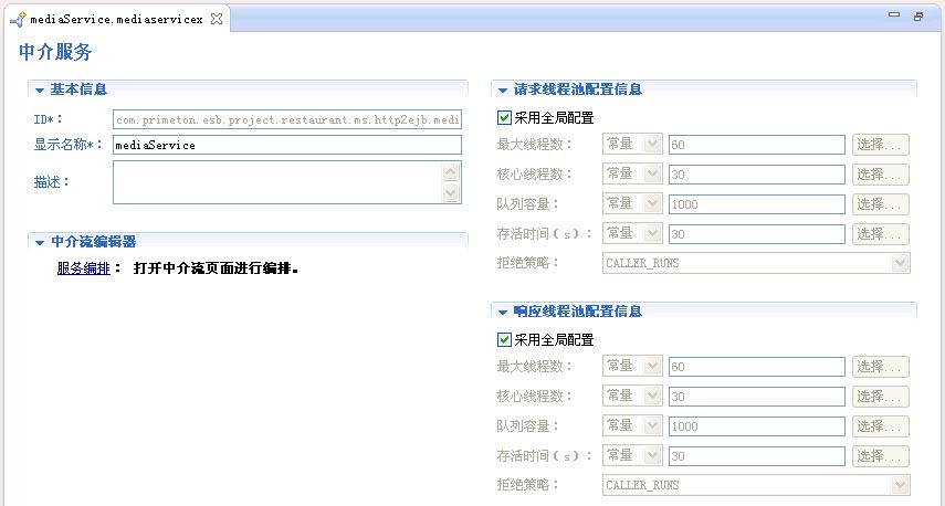 注意:步骤7中参数的"返回值"和步骤9中的"参数",由于Java图元的返回至是下一个图元的输入参数,所以参数值"outMeg"一定要对应一致,否则会出错。 至此,中介服务创建完成。