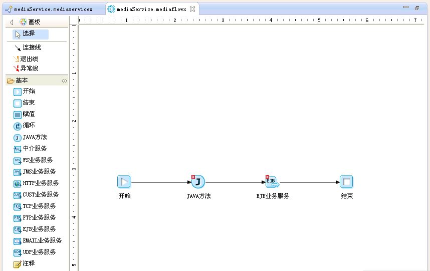 4.在"中介服务"编辑页面点击"服务编排"链接,进入编排中介服务的界面。在"选用板"中将"JAVA方法"和"JAVA业务服务"图元拖拽到右边的编辑区,并用"连接线"依次连接,如下图所示。