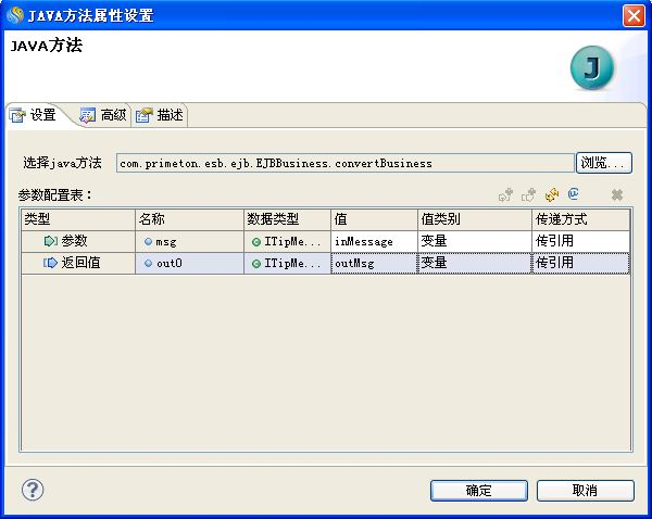 8.双击编辑区中的"EJB业务服务"图元,弹出JMS业务服务的"设置对话框",点击"浏览..."按钮,选择刚创建的EJB业务服务。 9.在"设置对话框"中设置"参数配置表",并点击"确定"按钮,如下图所示。