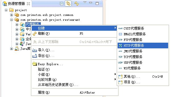 1. 在资源管理器中,选中新建的业务Module的代理服务项,点击右键,选择"创建->HTTP代理服务"菜单项,创建HTTP代理服务,如下图所示。