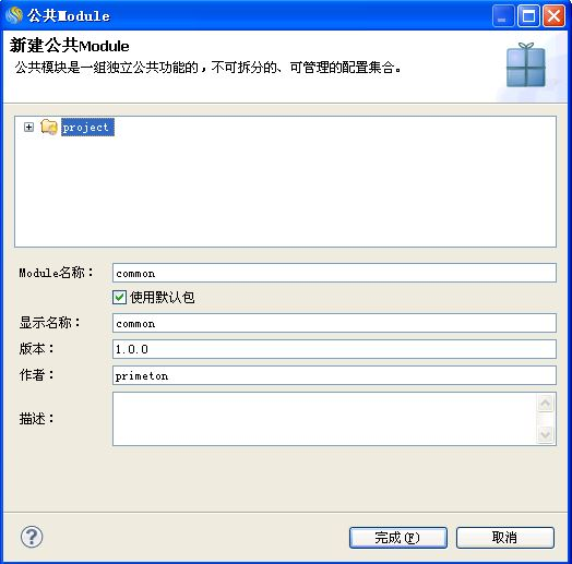 2.在"公共Module"向导中,输入公共Module的相关信息,点击"完成"按钮,创建公共Module,如下图所示。