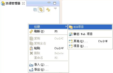 打开ESB Studio,在资源管理器中,点击右键,选择"创建->ESB项目"菜单项,创建工程,如下图所示。
