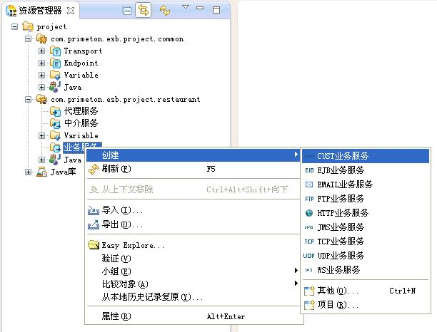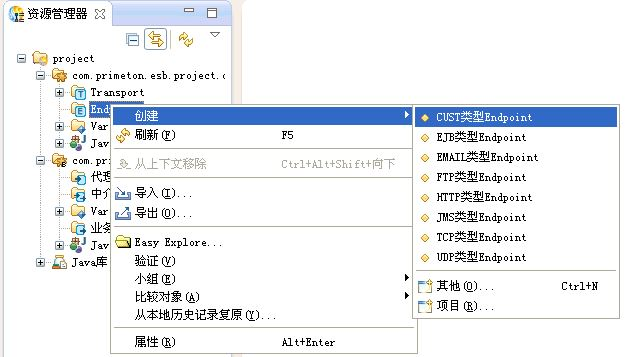 在资源管理器中,选中新建的公共Module中的"Endpoint",点击右键,选择"创建->CUST类型Endpoint"菜单项,创建CUSTEndpoint,如下图所示。