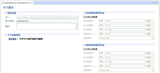 注意:步骤7中参数的"返回值"和步骤9中的"参数",由于Java图元的返回至是下一个图元的输入参数,所以参数值"outMeg"一定要对应一致,否则会出错。 至此,中介服务创建完成。