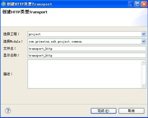2.在"创建Http类型Transport"向导中,输入HttpTransport的相关信息,点击"完成"按钮,创建HttpTransport。