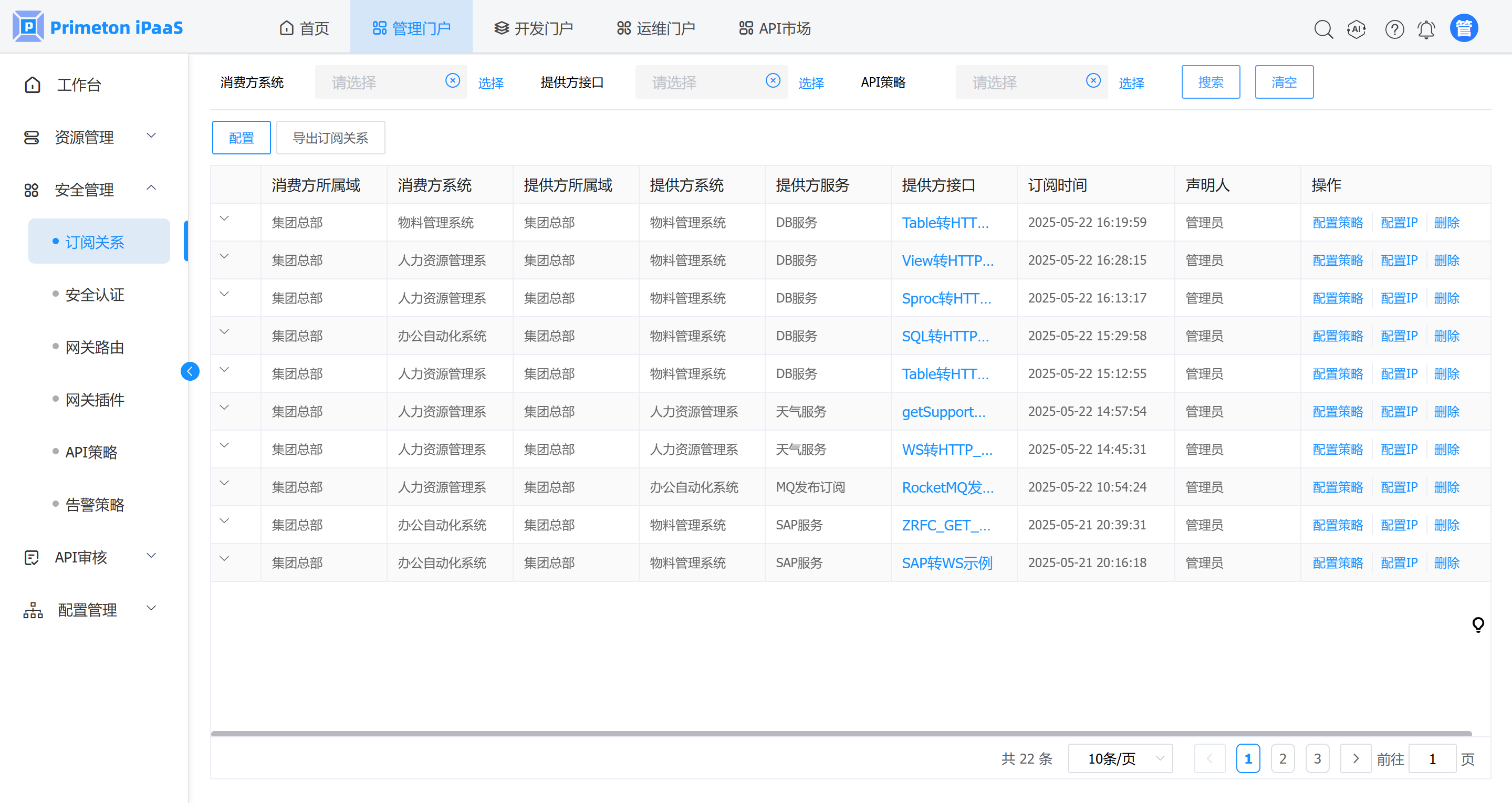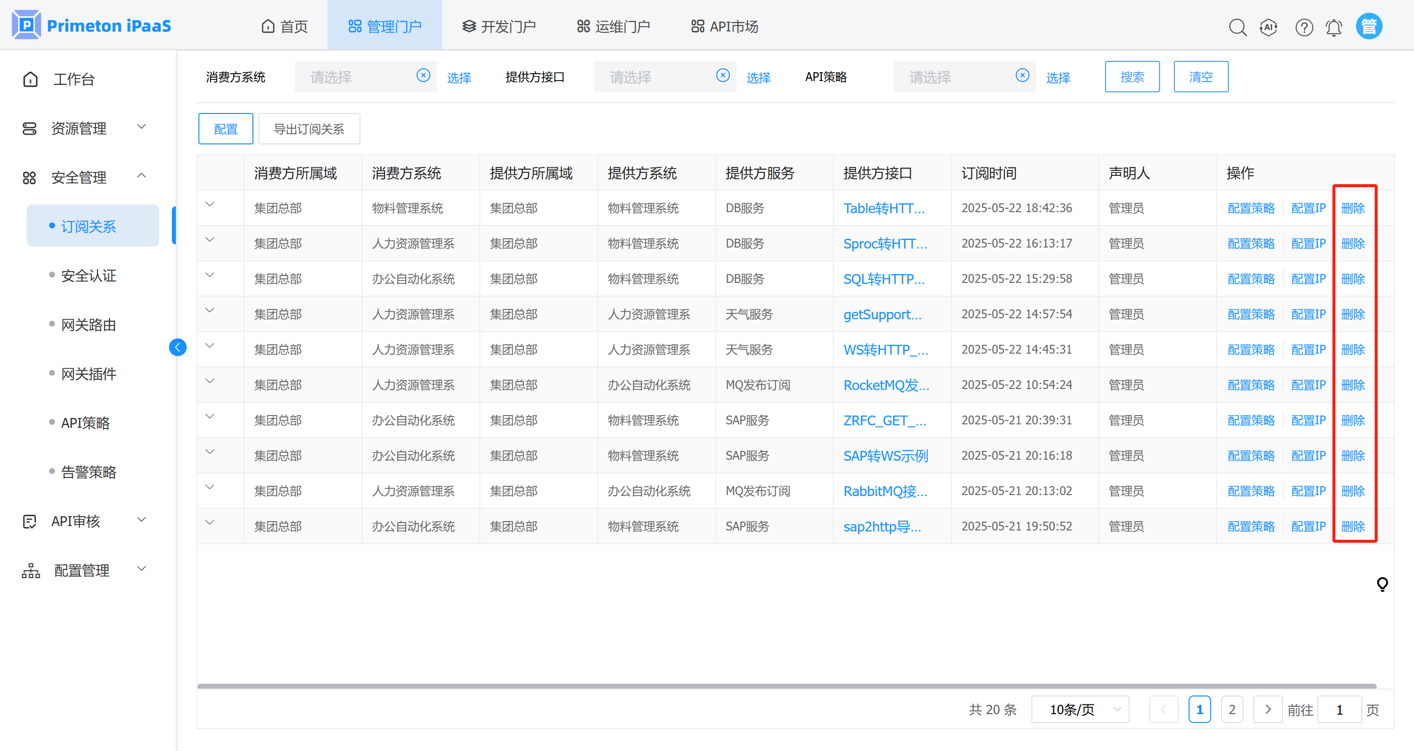 1. 管理人员登录系统,进入管理门户,点击菜单“安全管理”>“订阅关系”,打开订阅关系界面,选择需要删除的订阅关系记录,点击操作列“删除”按钮,删除对应的订阅关系。