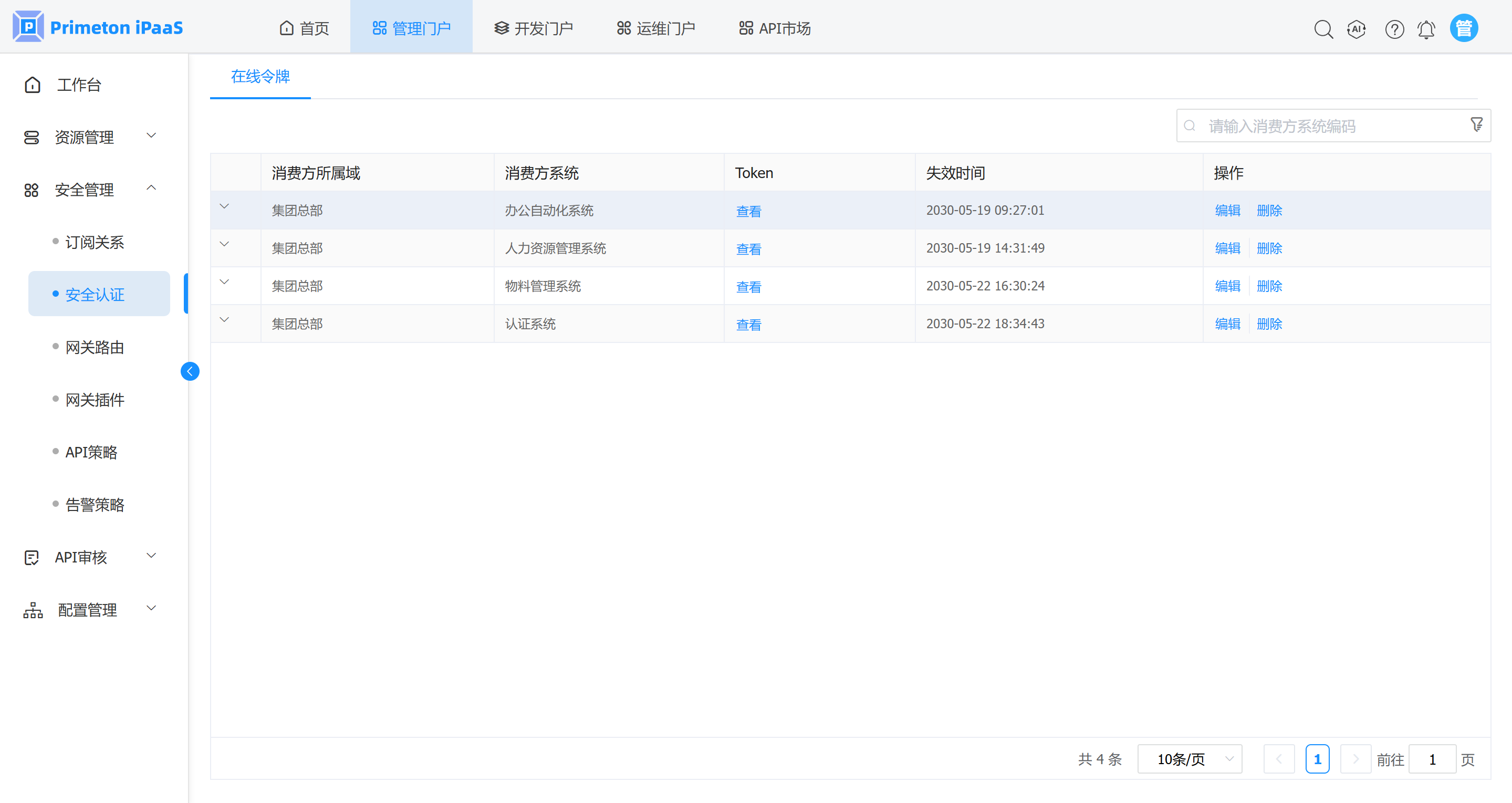 2. 确认需要删除的系统没有订阅关系后,点击菜单“安全管理”>“安全认证”,打开安全认证页面,可看到操作列有“删除”按钮。