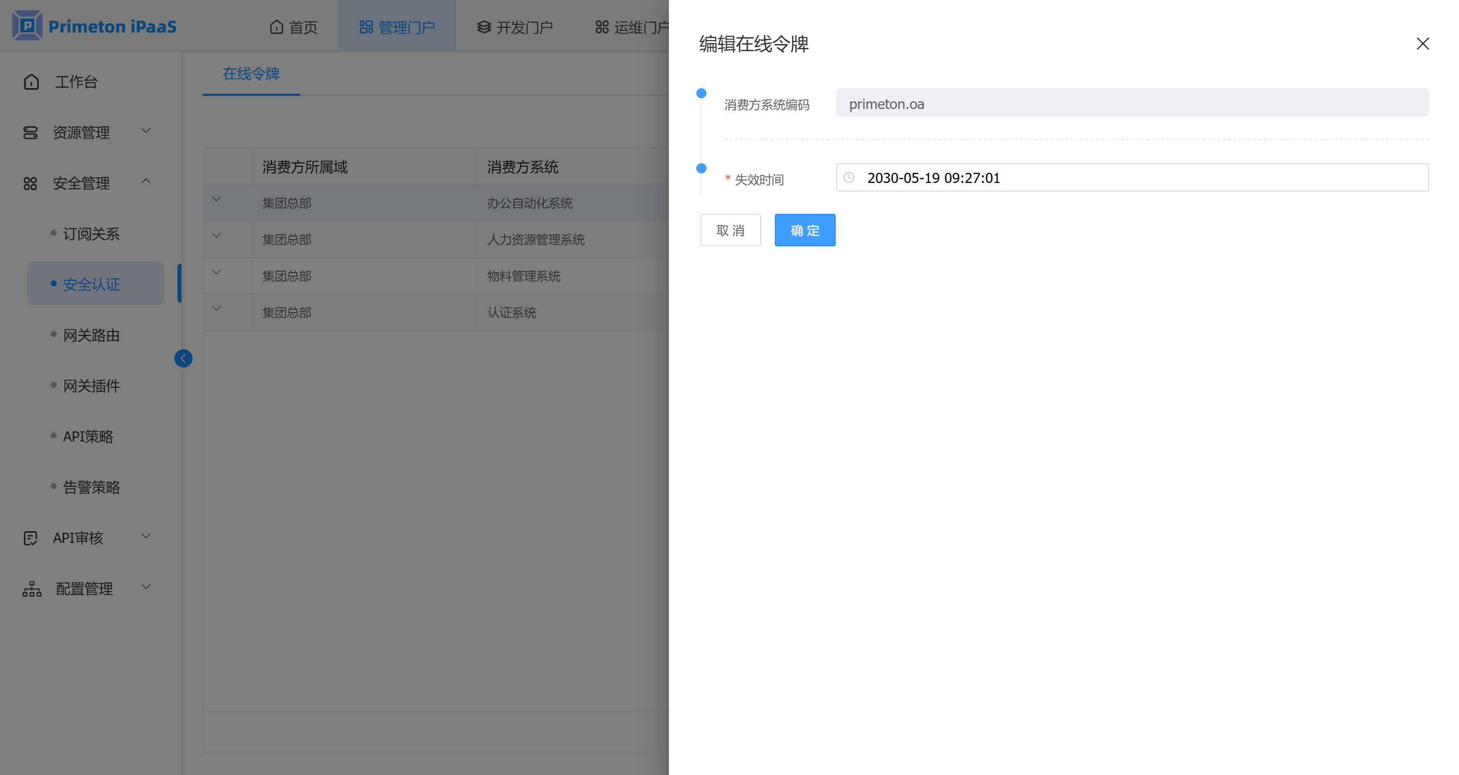 2. 编辑在线令牌信息,修改完成后,点击“确定”按钮保存信息。