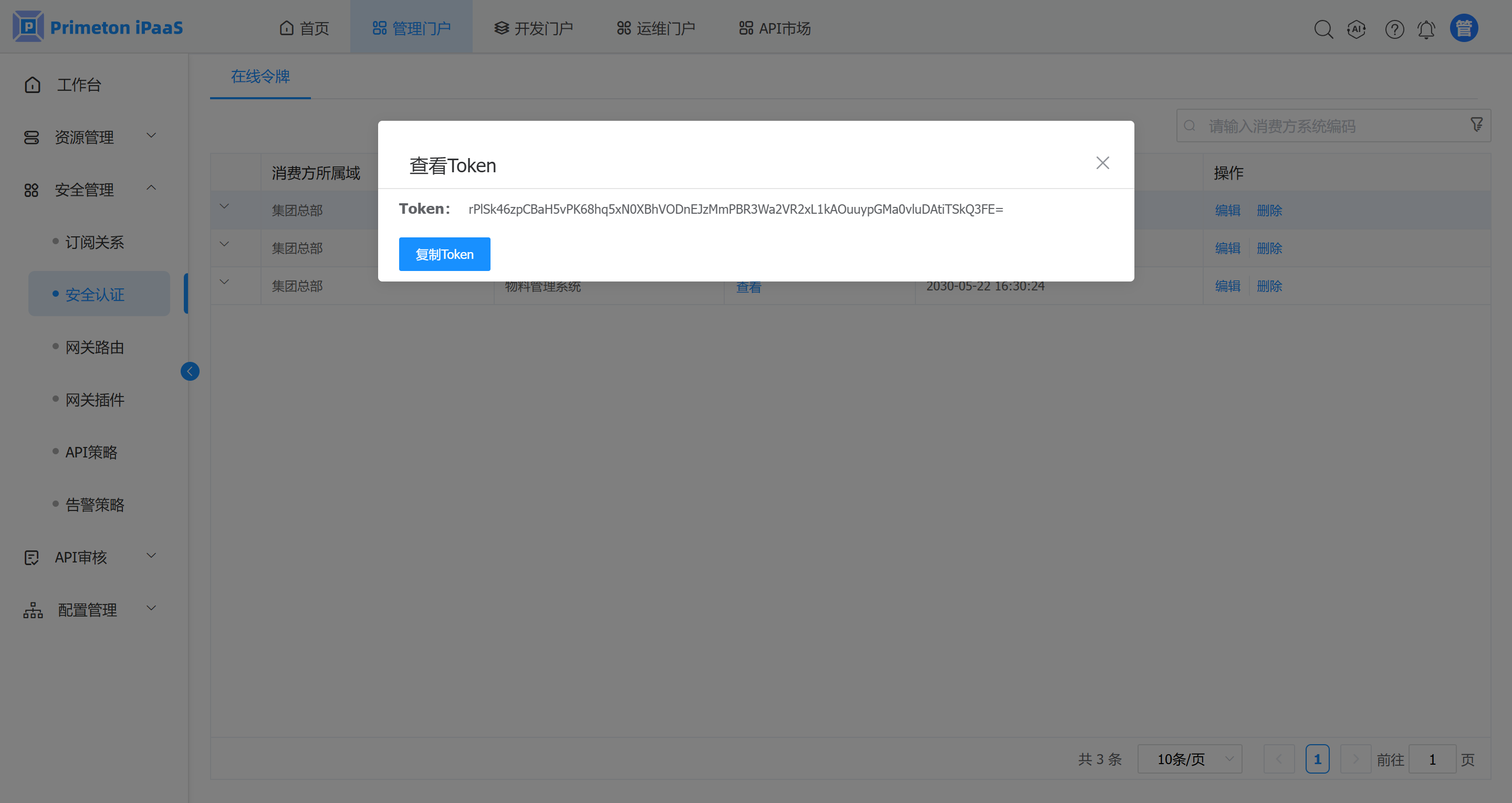新增订阅关系或者在API门户订阅接口审核通过后,会生成“在线令牌”。
