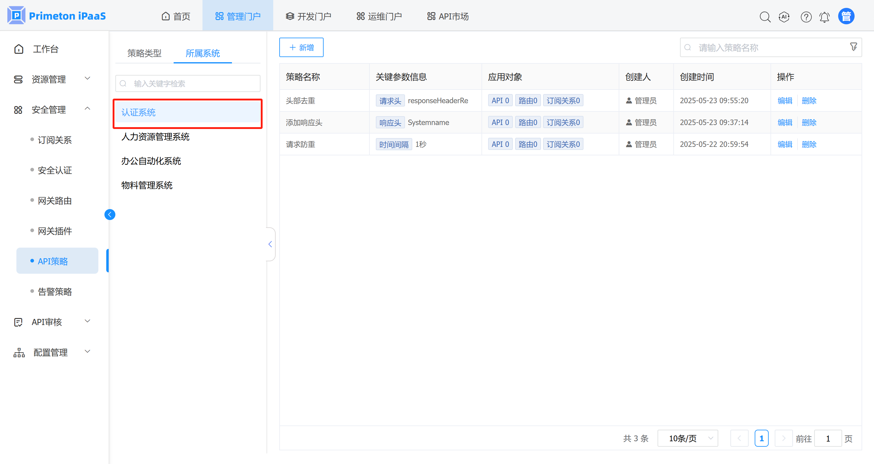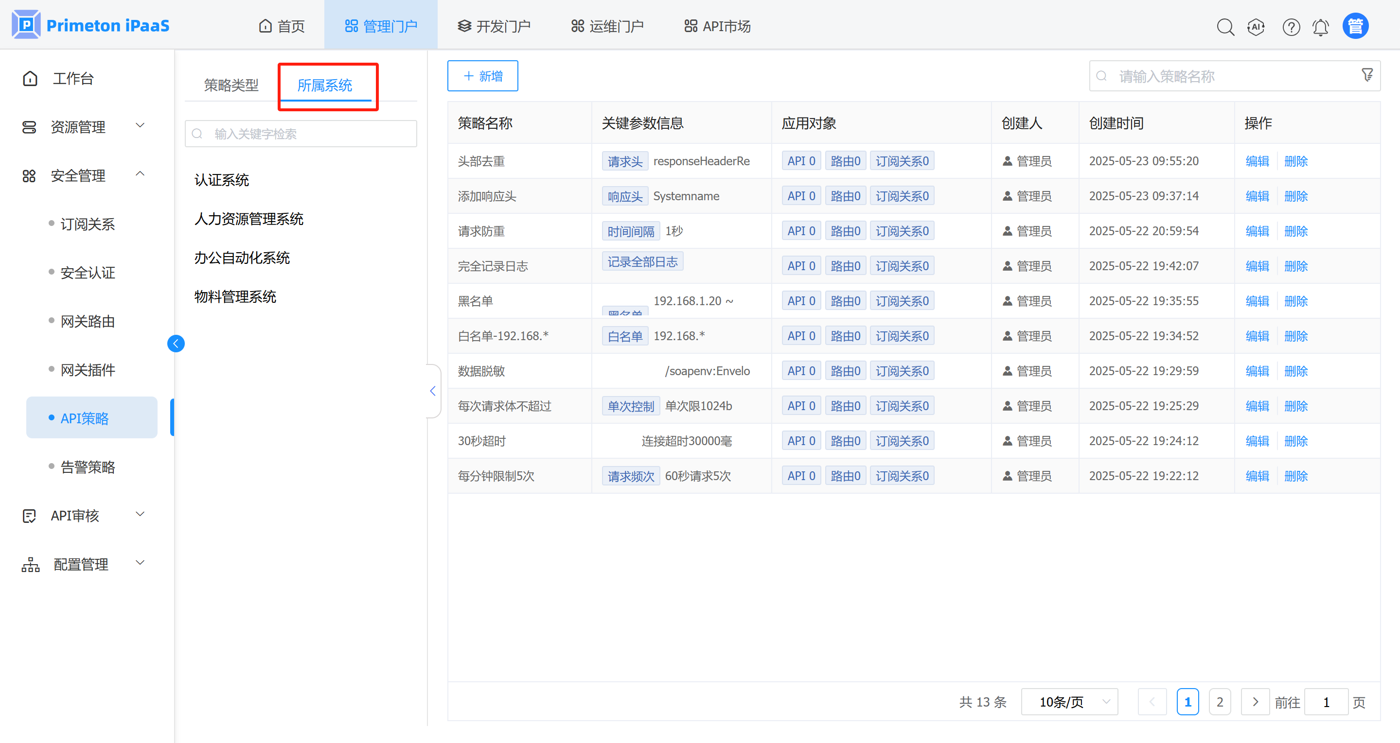 管理人员登录系统,进入管理门户,点击菜单“安全管理”>"API策略“,进入API策略页面,选择策略类型右侧的所属系统页签,可查看各个系统下所有策略。