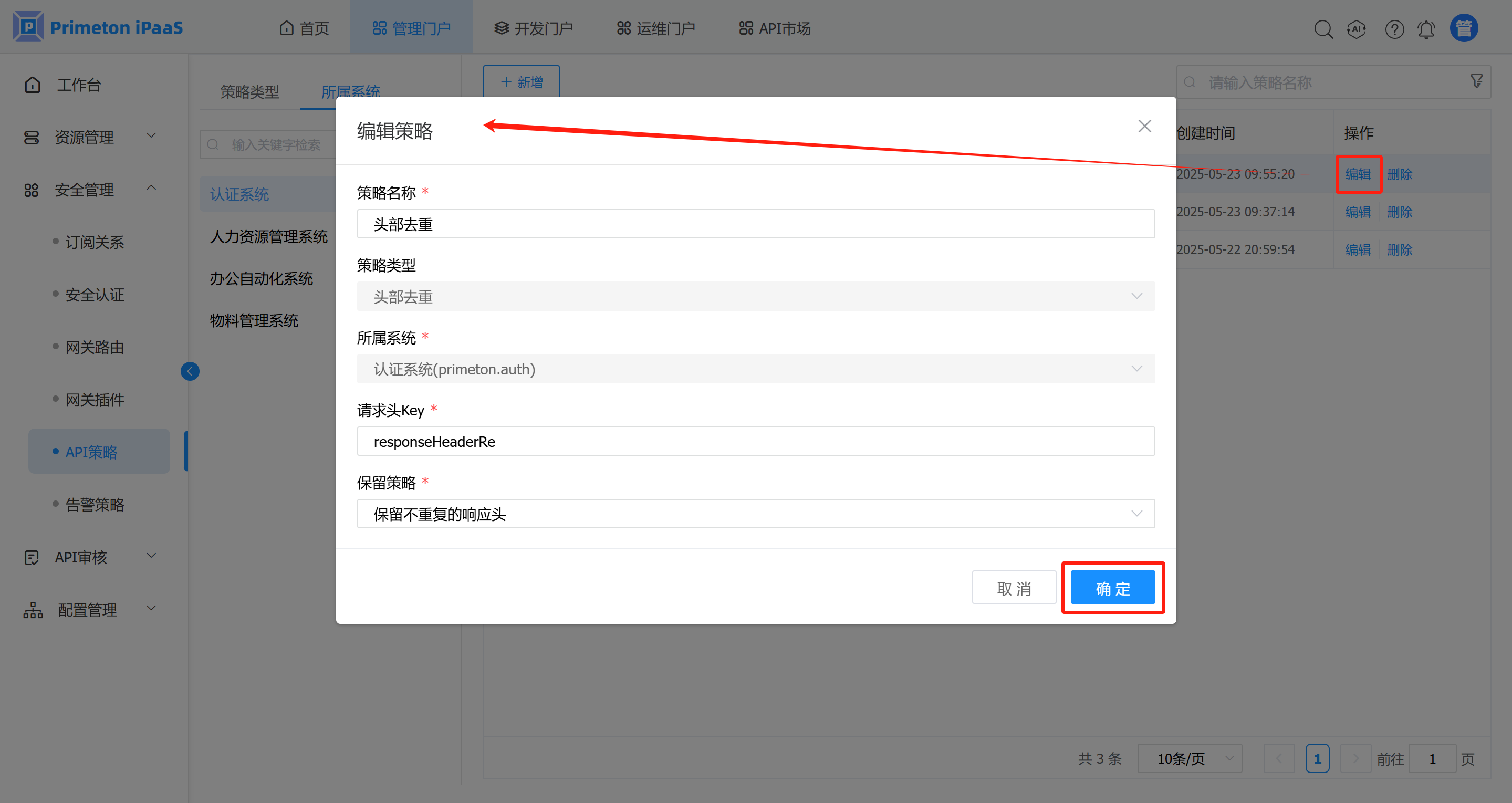 右侧展示的API策略列表,点击操作栏下的“编辑”按钮,编辑策略完成后,点击“保存”按钮。