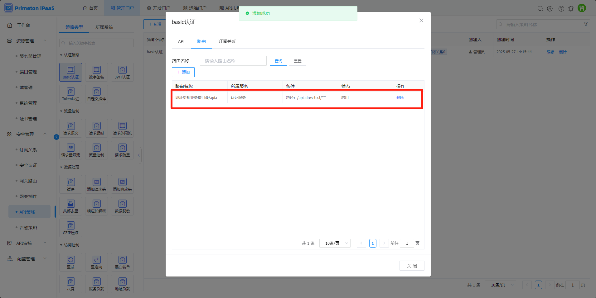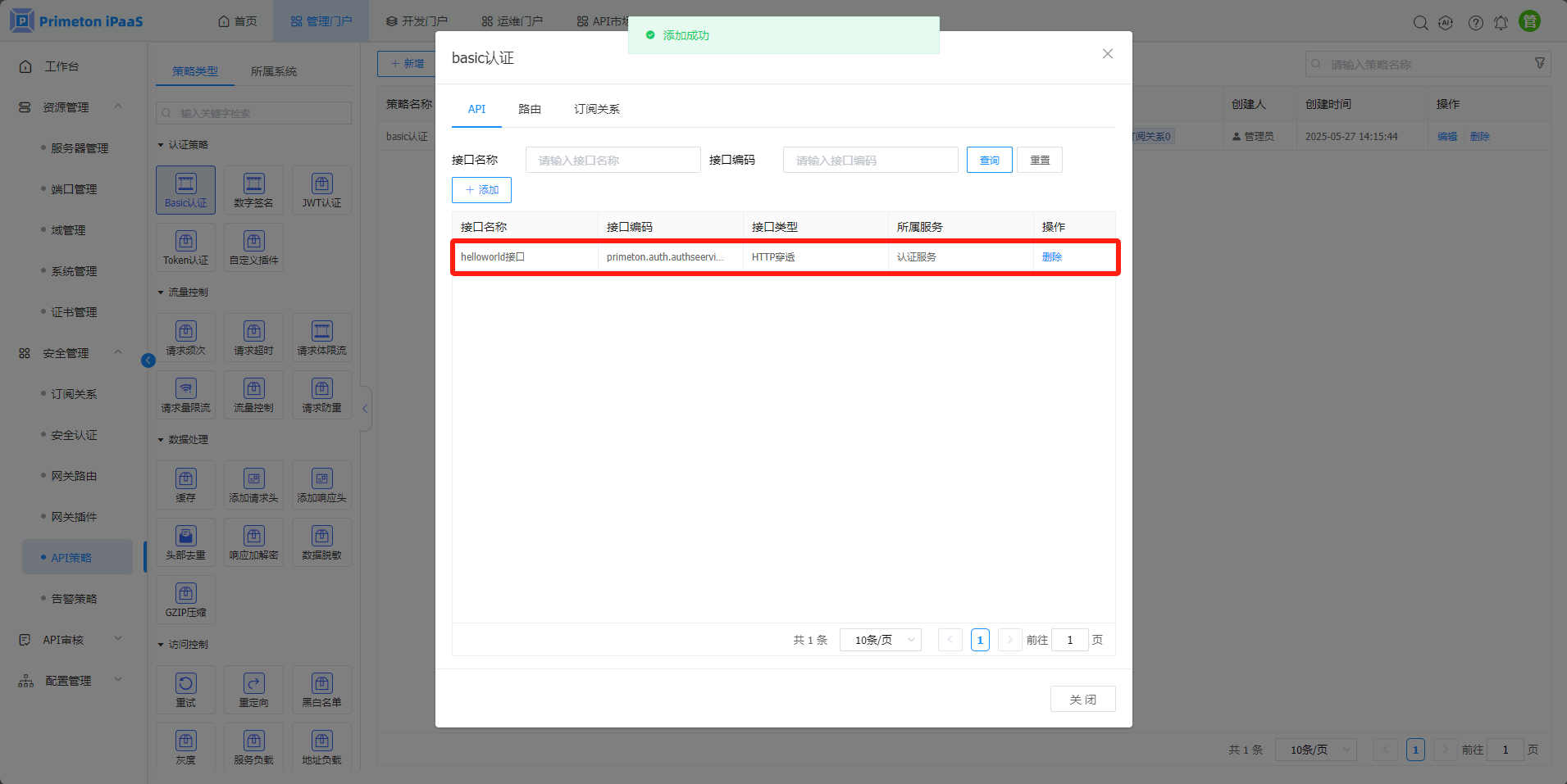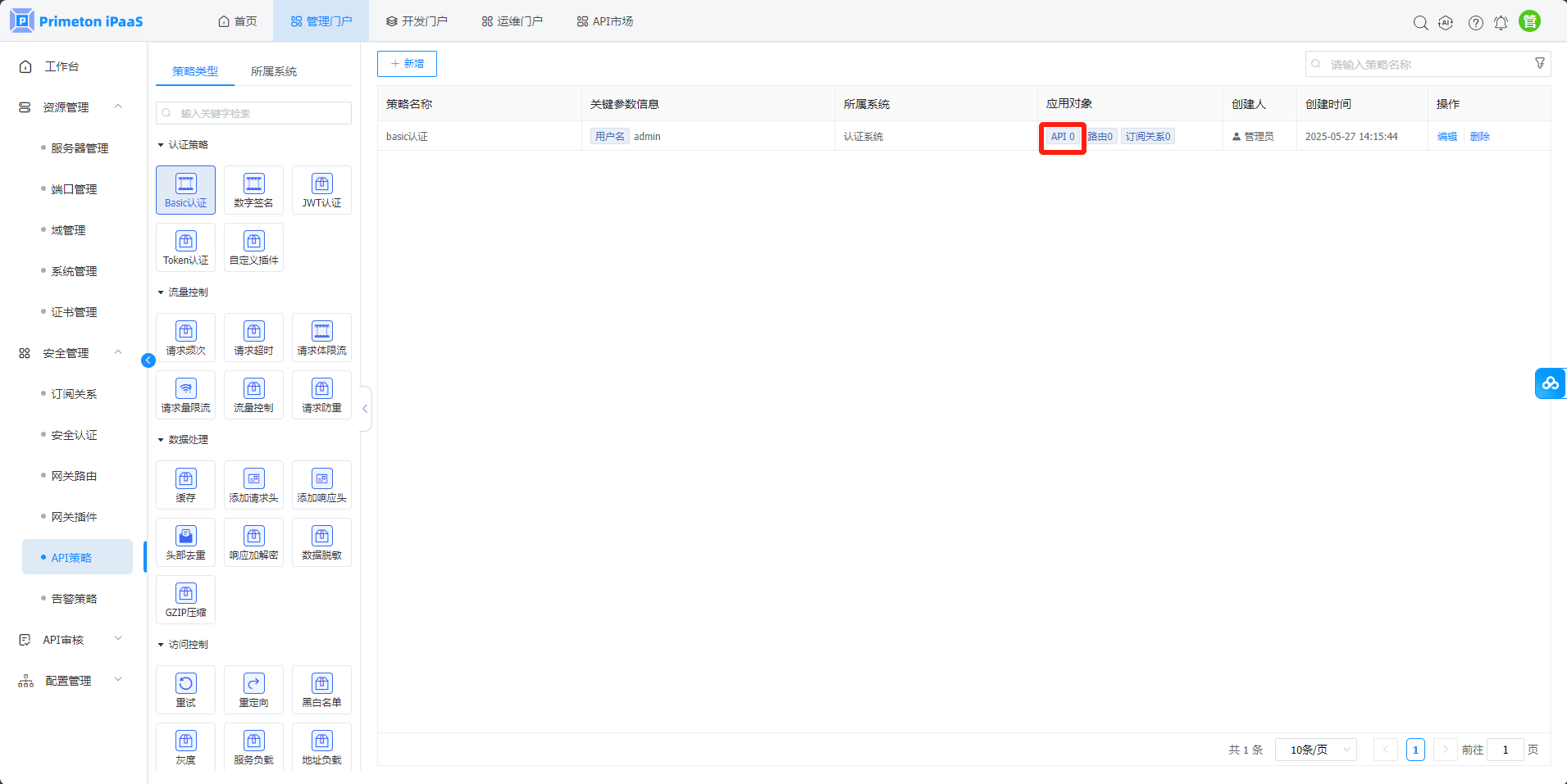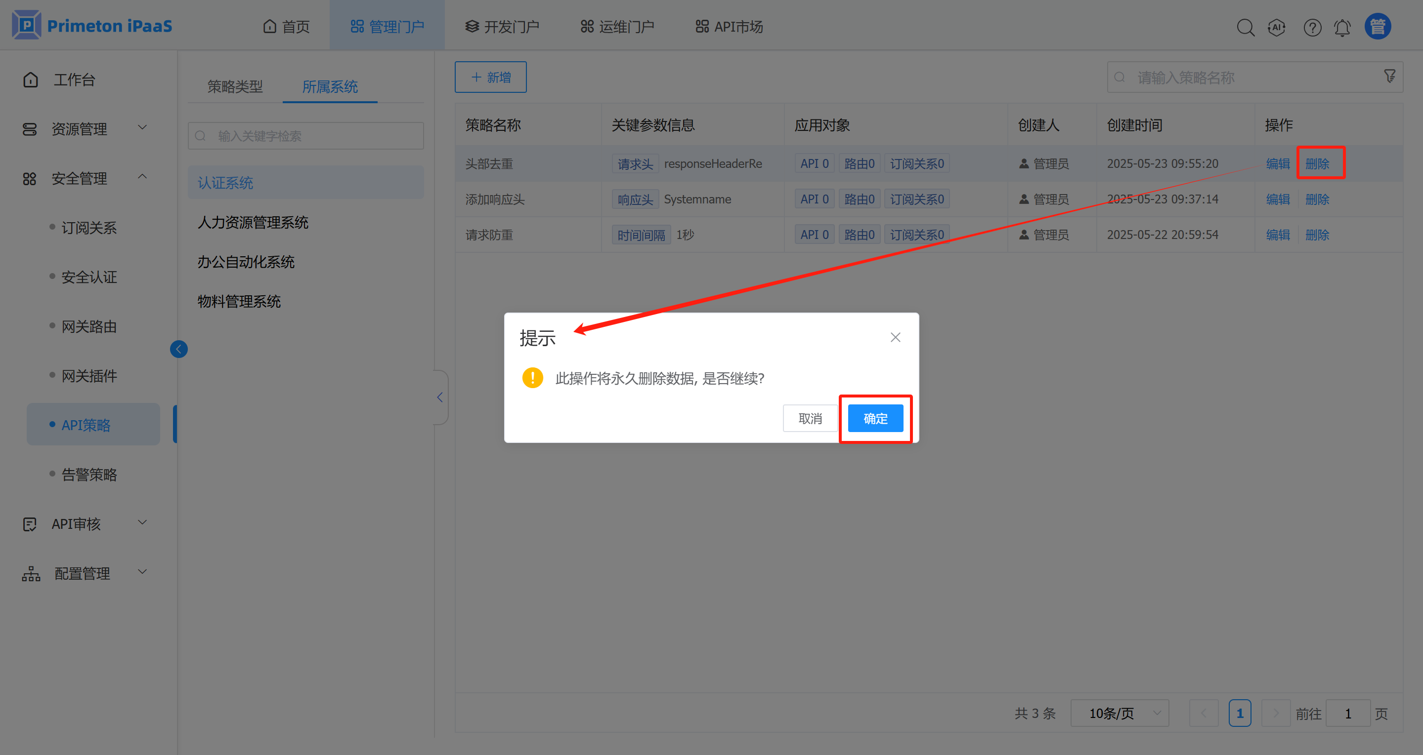 右侧展示的API策略列表,点击操作栏下的“删除”按钮,点击“确定”按钮后,即可删除策略。