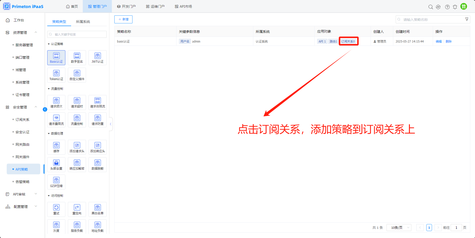 2其他策略:一个API只能被一种策略类型的一个策略关联,例如:test接口被流量控制策略的策略A关联,则test接口无法被流量控制策略的策略B关联,但是test接口还可以被请求体限流策略的策略1关联。路由、订阅关系和API策略的限制一致。