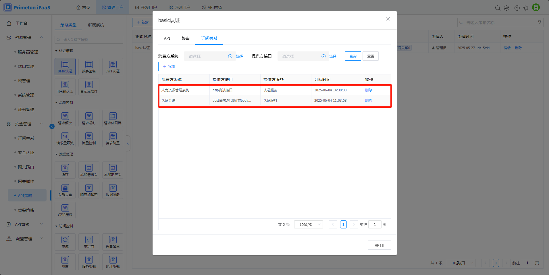 1认证策略:一个API只能被认证策略下的某一种认证策略类型的一个策略关联,例如:test接口被Basic认证策略的策略A关联,则test接口无法被Basic认证策略的策略B关联,也无法被Token认证策略的策略1关联。路由、订阅关系和API的限制一致。