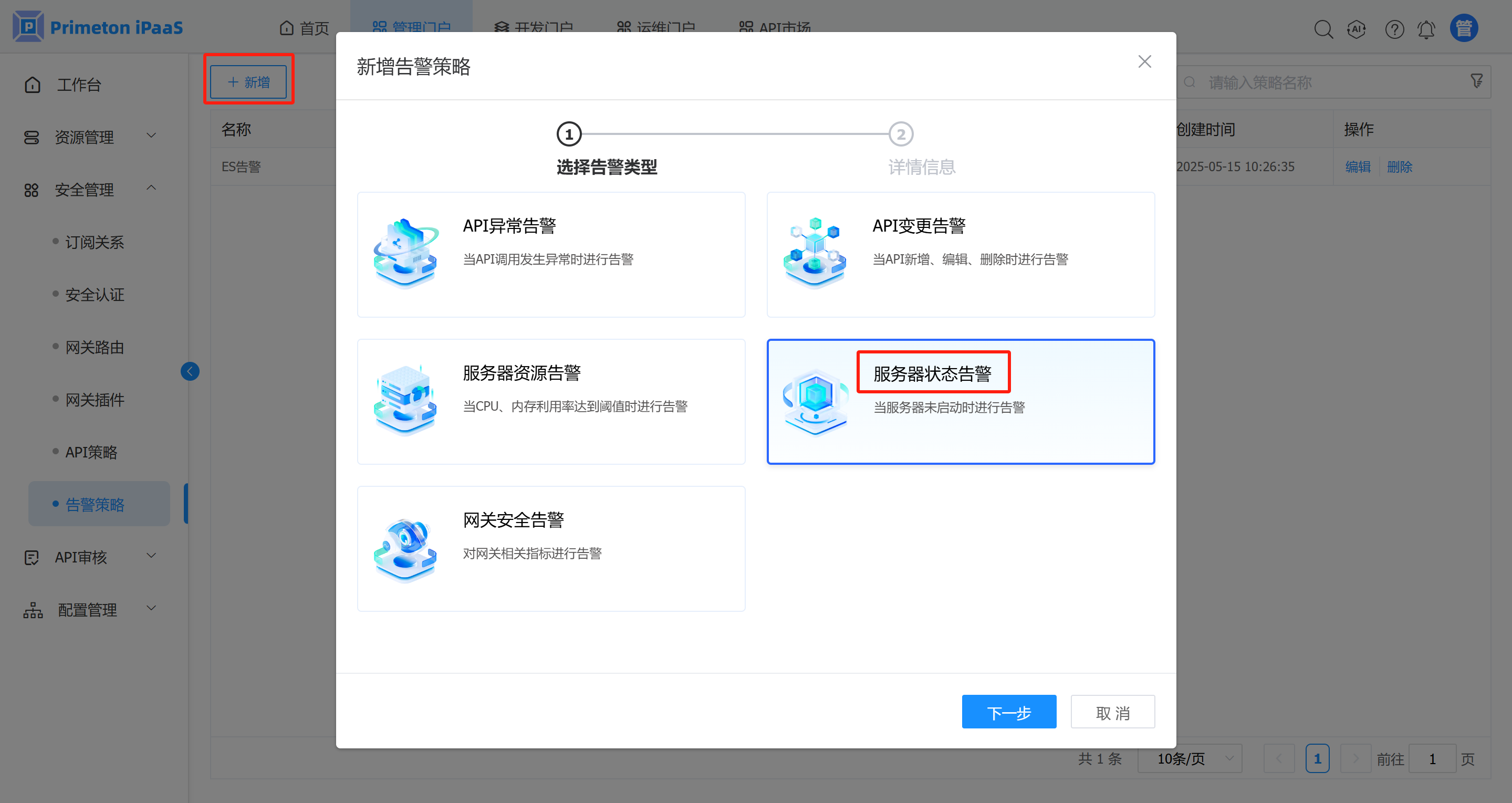 注意: 服务器状态告警开启后,系统会定时(每30分钟)探测服务器状态,如果服务器下线,会发送告警信息。