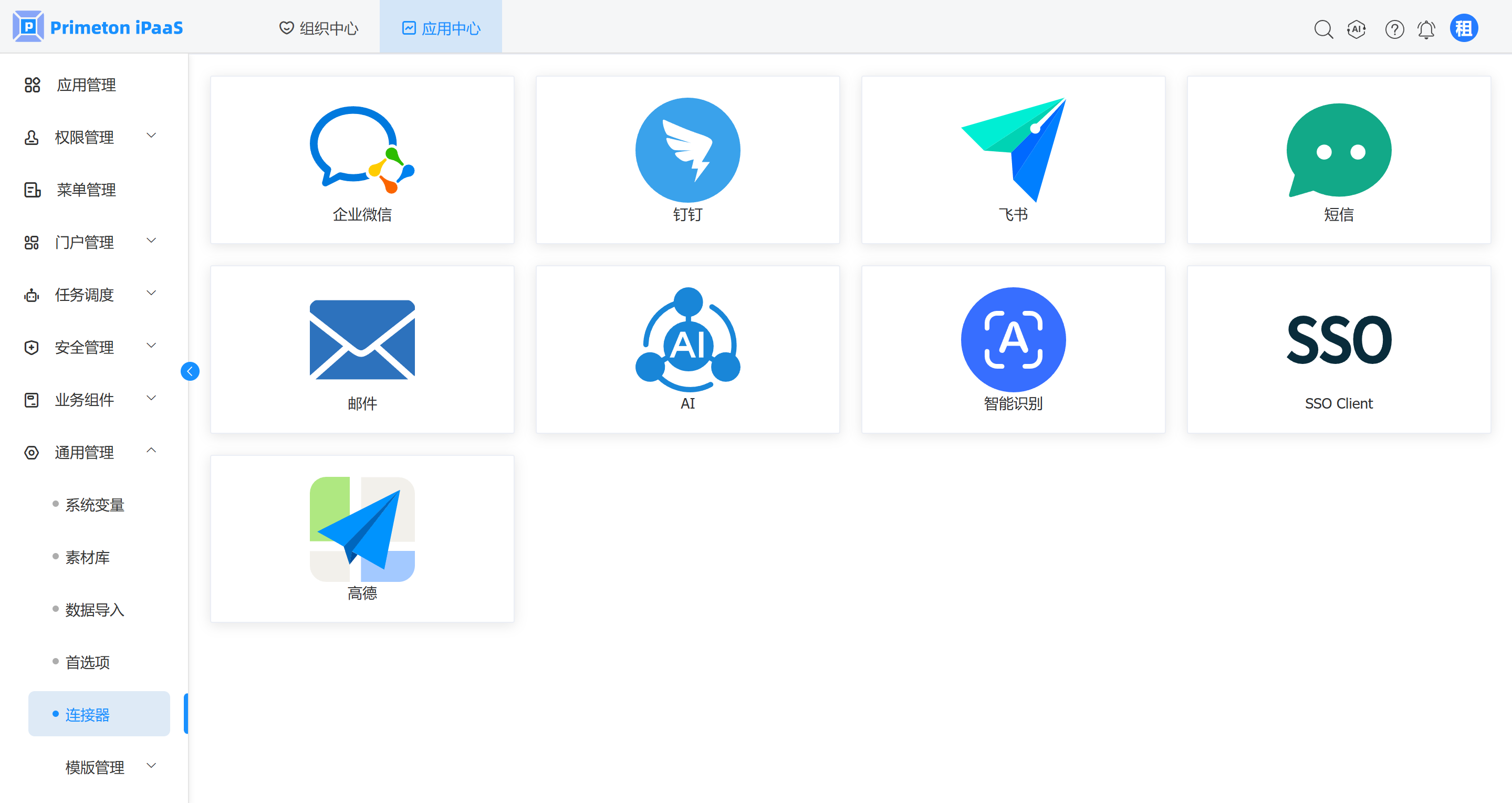 当没有可选的告警方式时,需切换admin(默认密码000000)用户登录系统,进入“应用中心”>"通用管理“>"连接器“页面,进行配置。