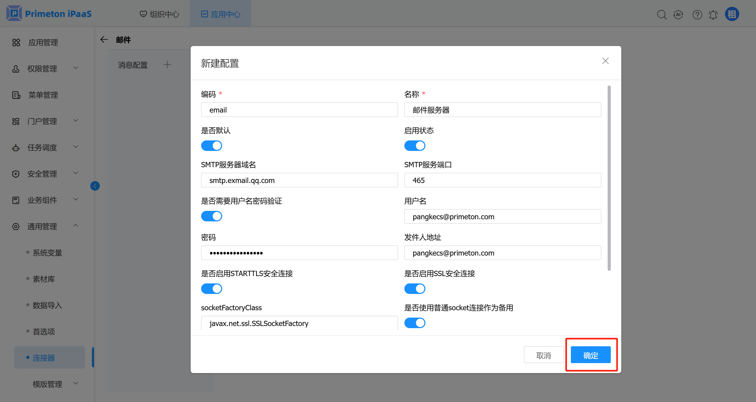 填写邮件服务器地址、端口、发件人邮箱、发件人密码、收件人邮箱等信息,点击“保存”即可。