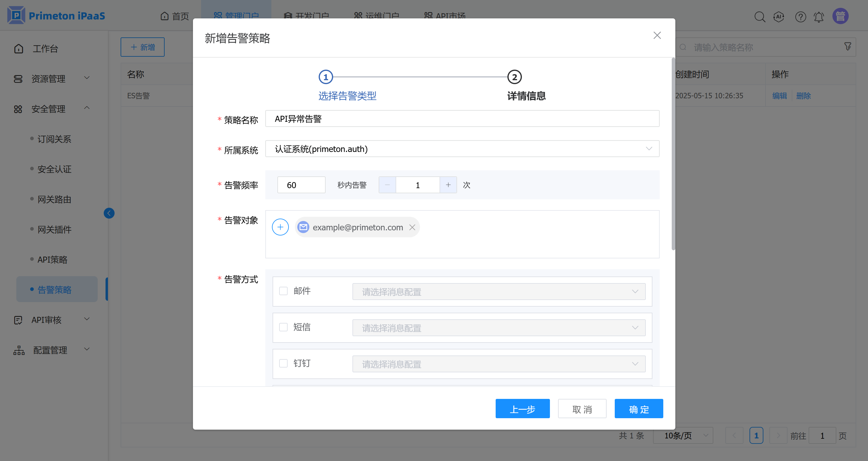 - API异常告警:当API出现异常时,触发告警,可指定告警频率、告警对象、告警方式等。