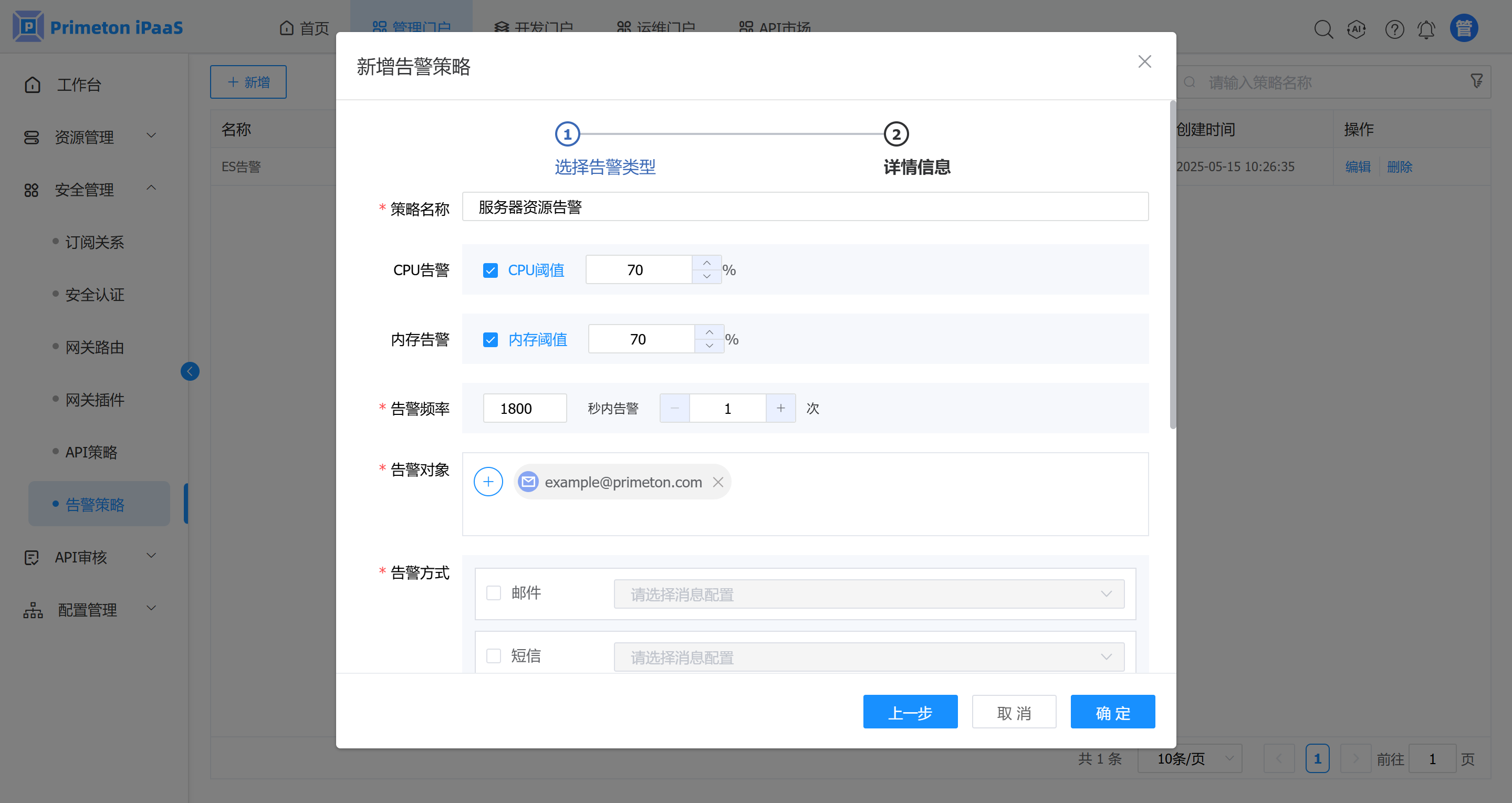 完成邮件配置后,管理人员登录系统,进入管理门户,点击菜单“安全管理”>"告警策略“,进入告警策略页面。点击“新增”按钮,选择“具体的告警类型”,点击下一步, 进入新增告警策略页面。即可选择刚才配置的邮件信息。
