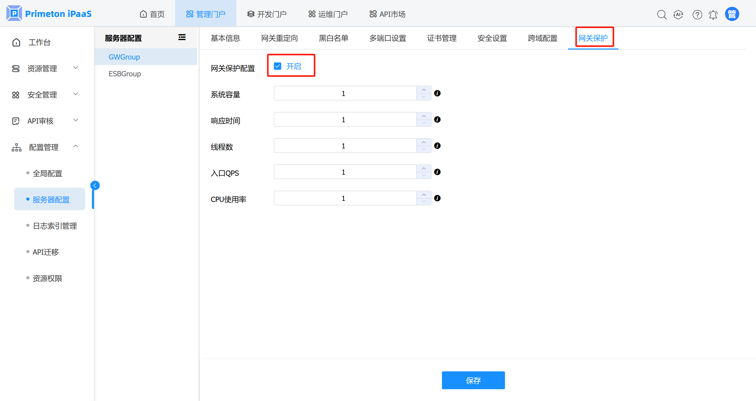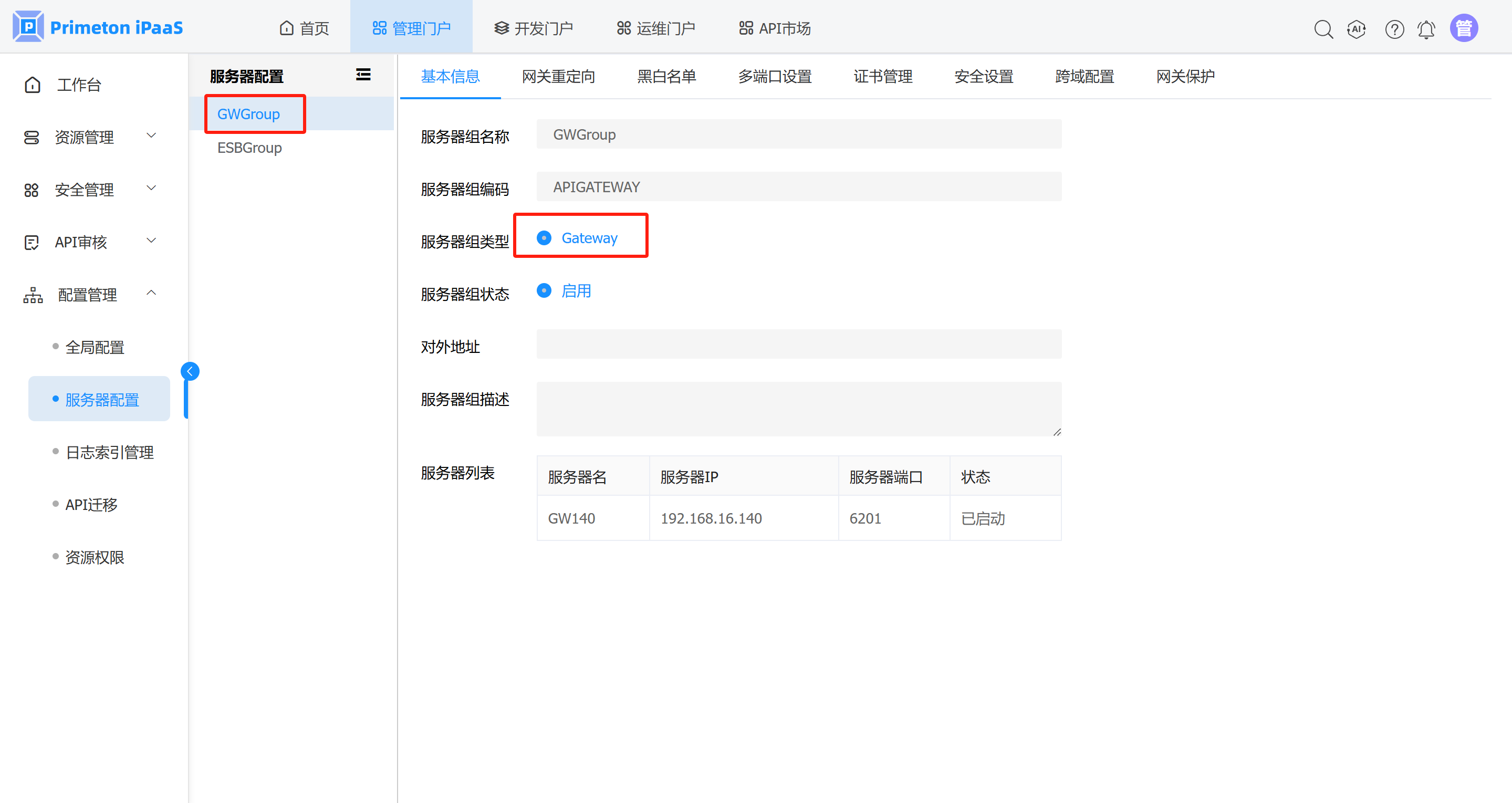 1. 管理人员登录系统,进入管理门户,点击菜单“配置管理”>“服务器配置”,选择类型为“Gateway”的服务器组,页面展示当前服务器组“基本信息”、“网关重定向”、“黑白名单”、“多端口设置”、“证书管理”、“安全设置”、“跨域配置”、“网关保护”等方面信息。