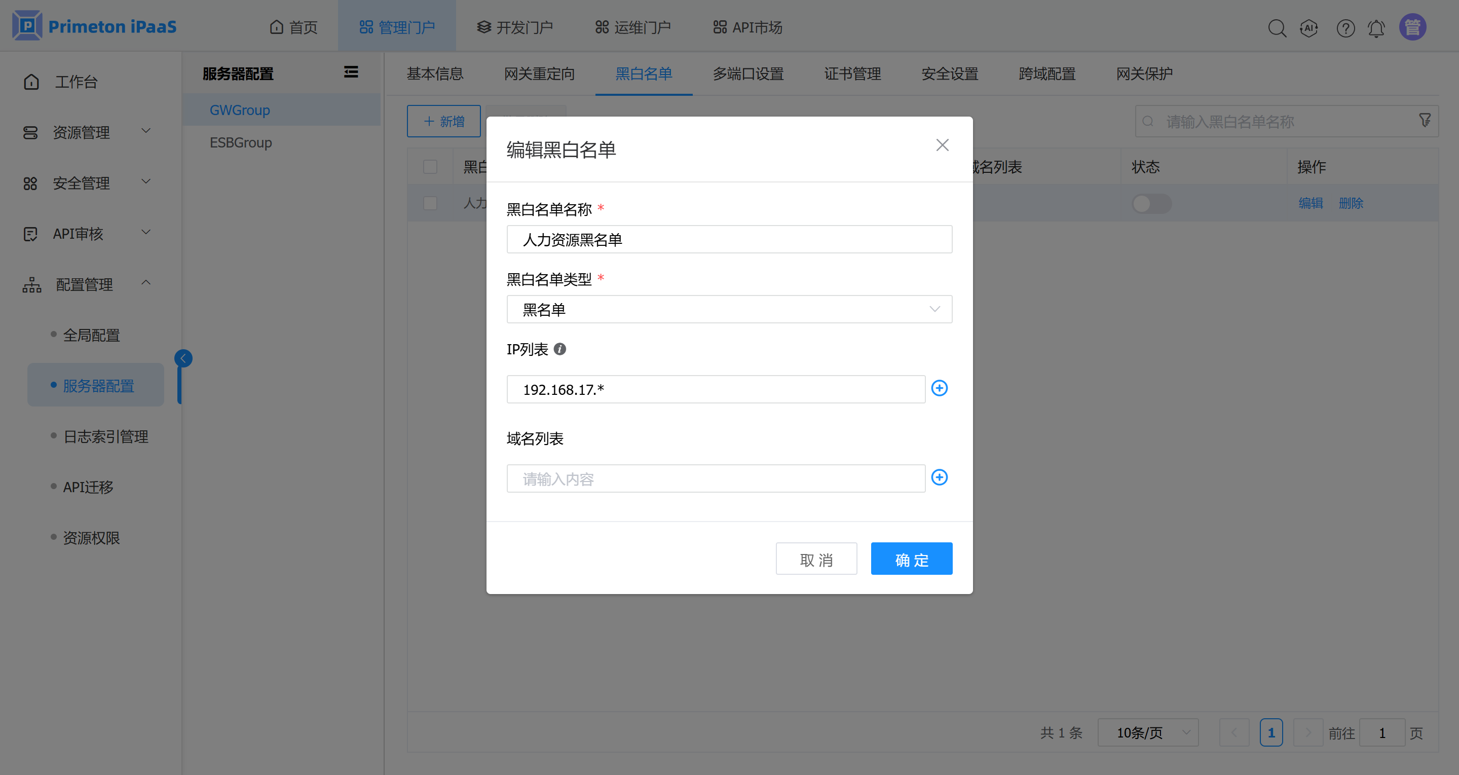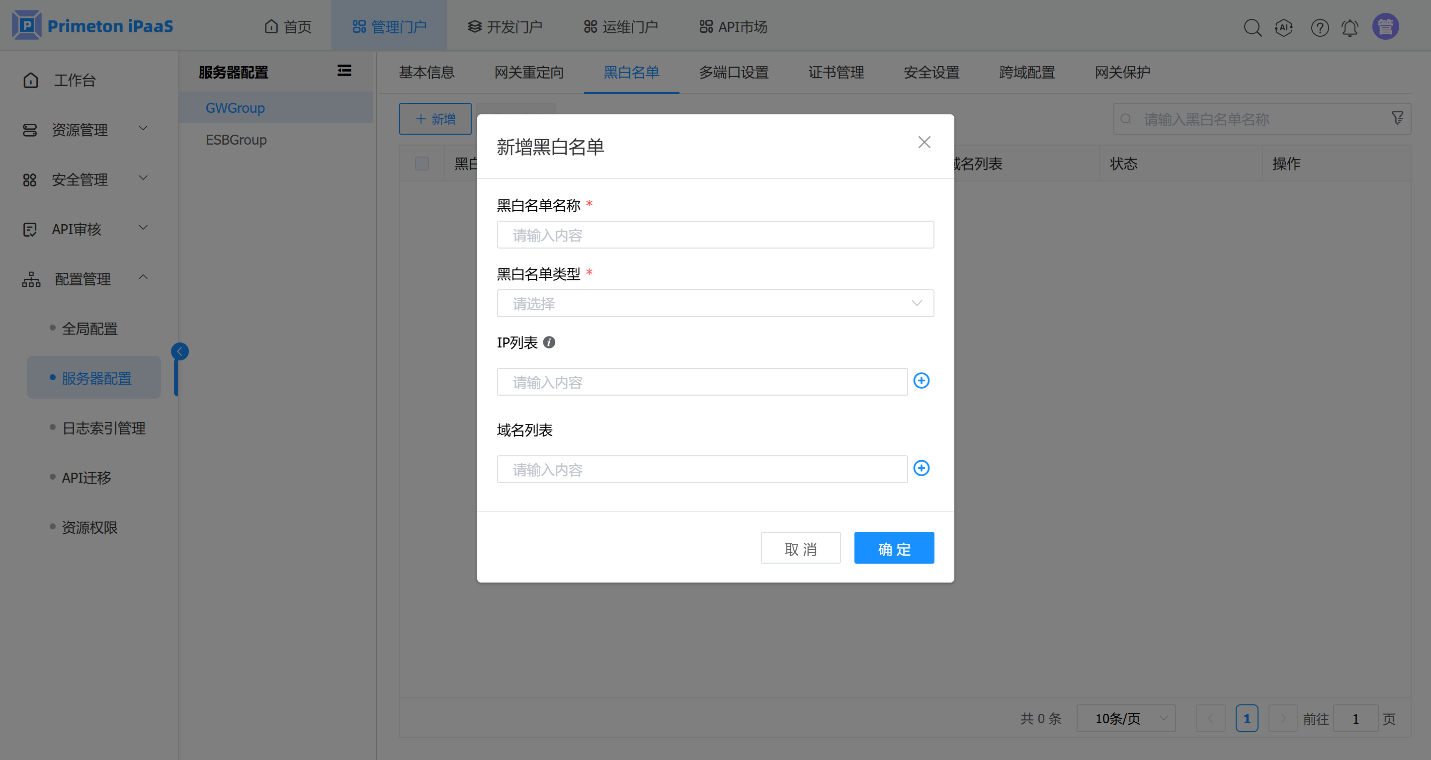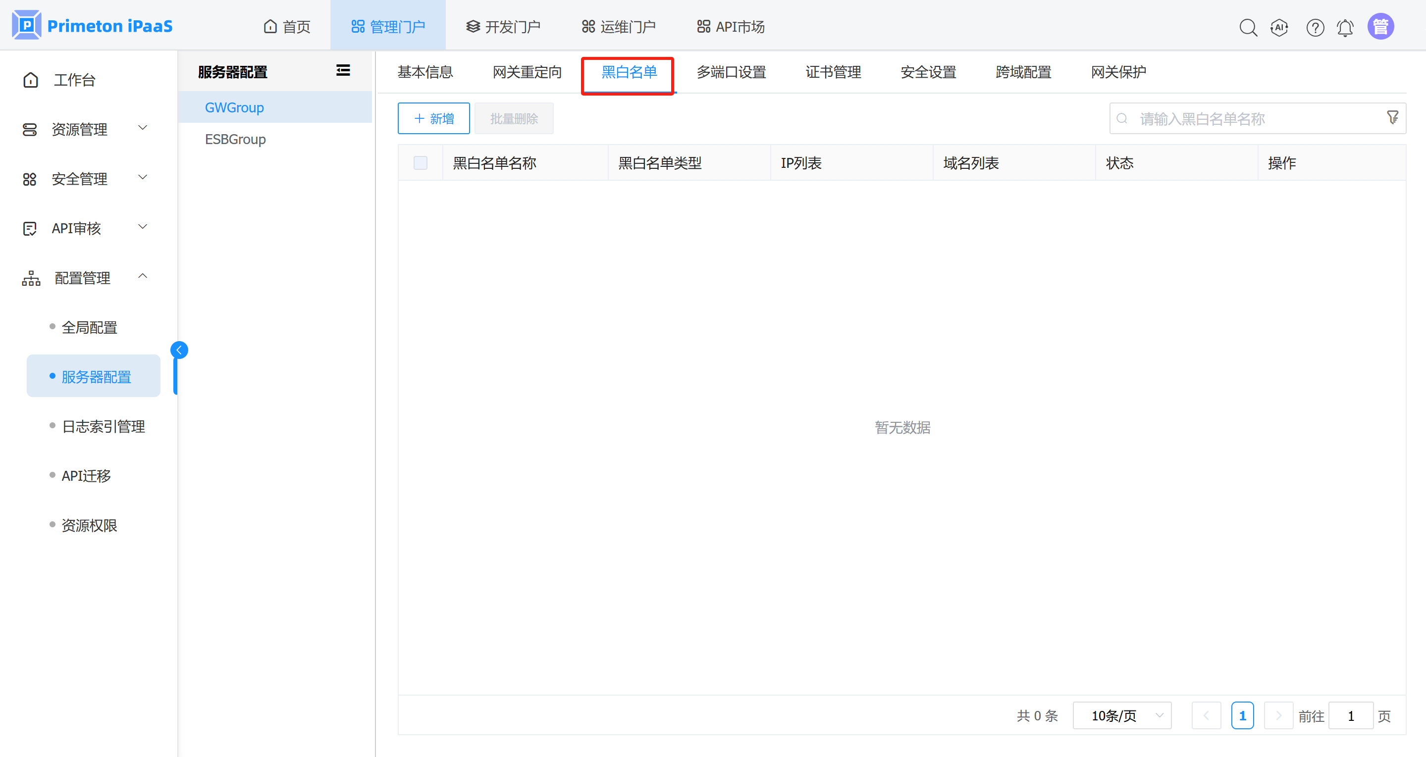 1. “服务器配置”页面,选择类型为“Gateway”的服务器组,进入“黑白名单”页签,进入黑白名单管理页面。