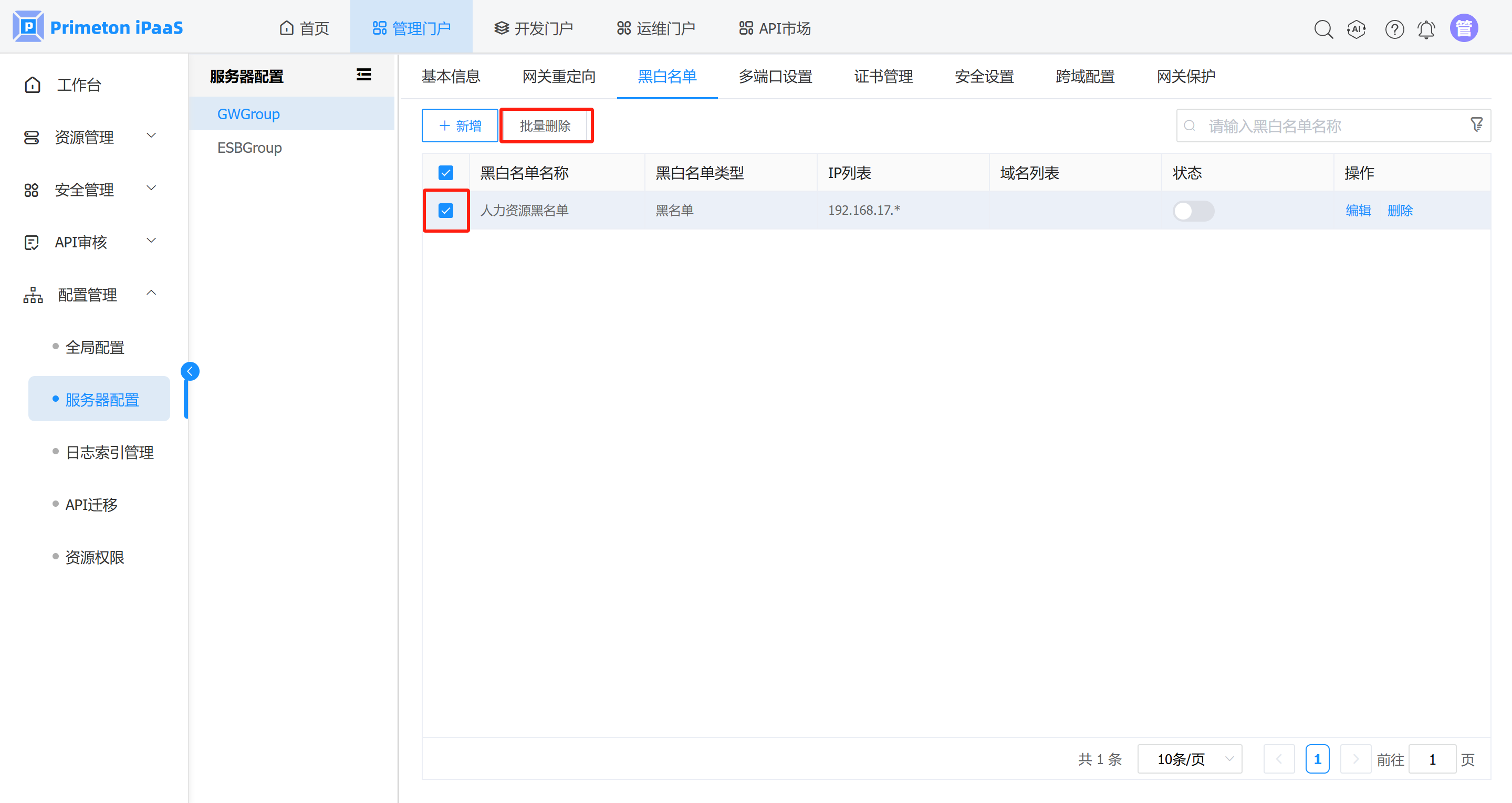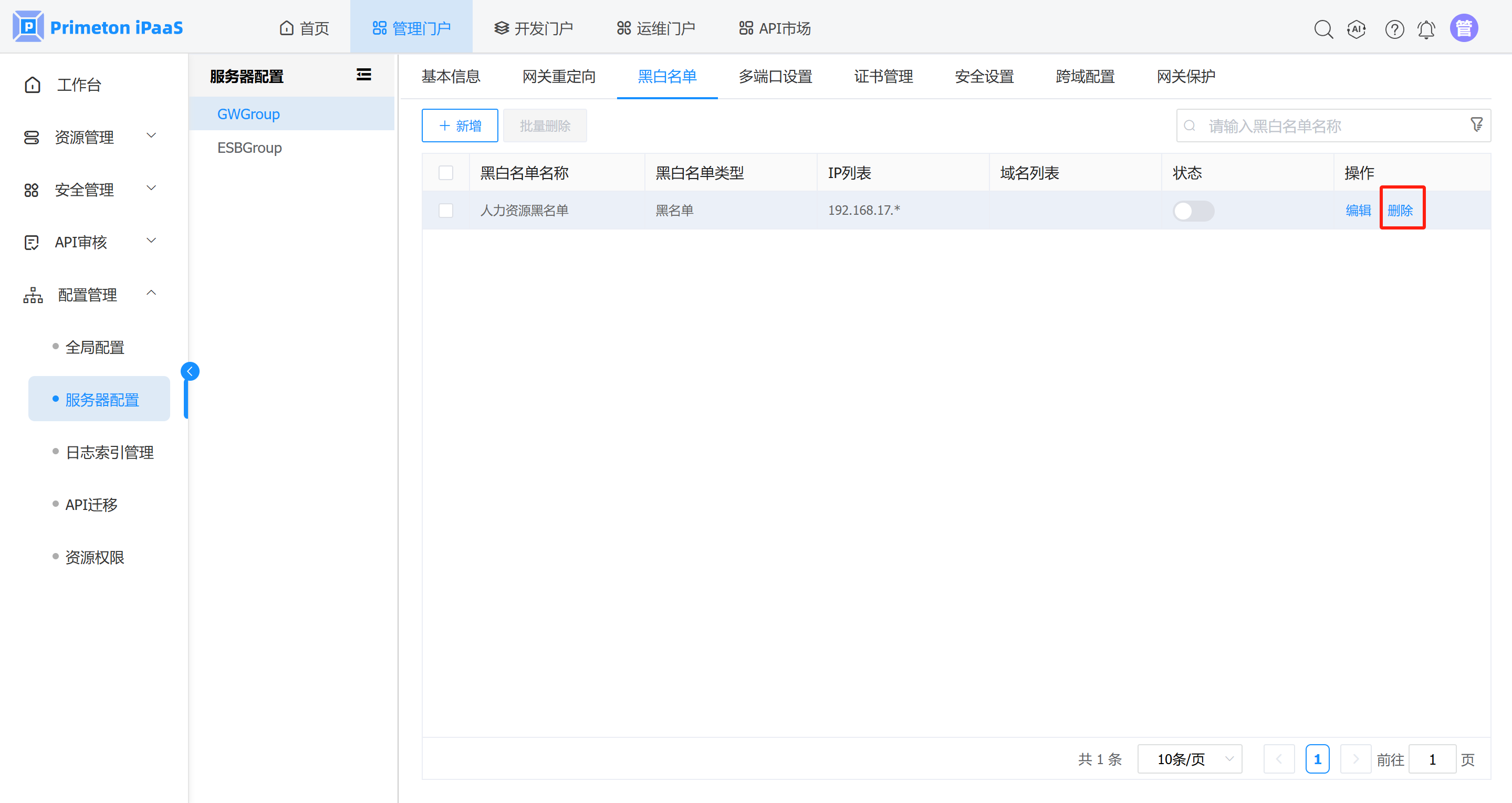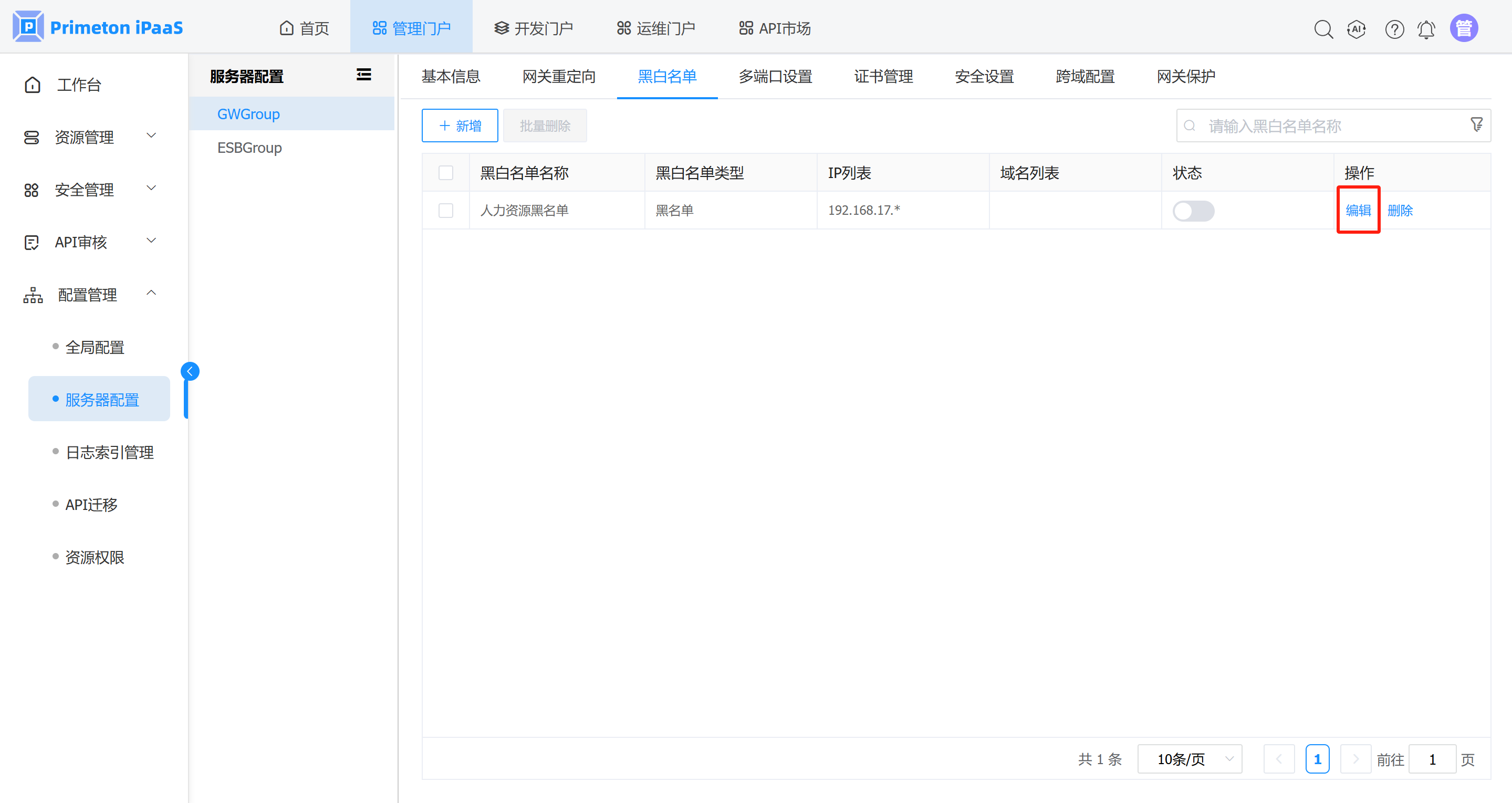 1. “服务器配置”页面,选择类型为“Gateway”的服务器组,进入“黑白名单”页签,进入黑白名单管理页面。
