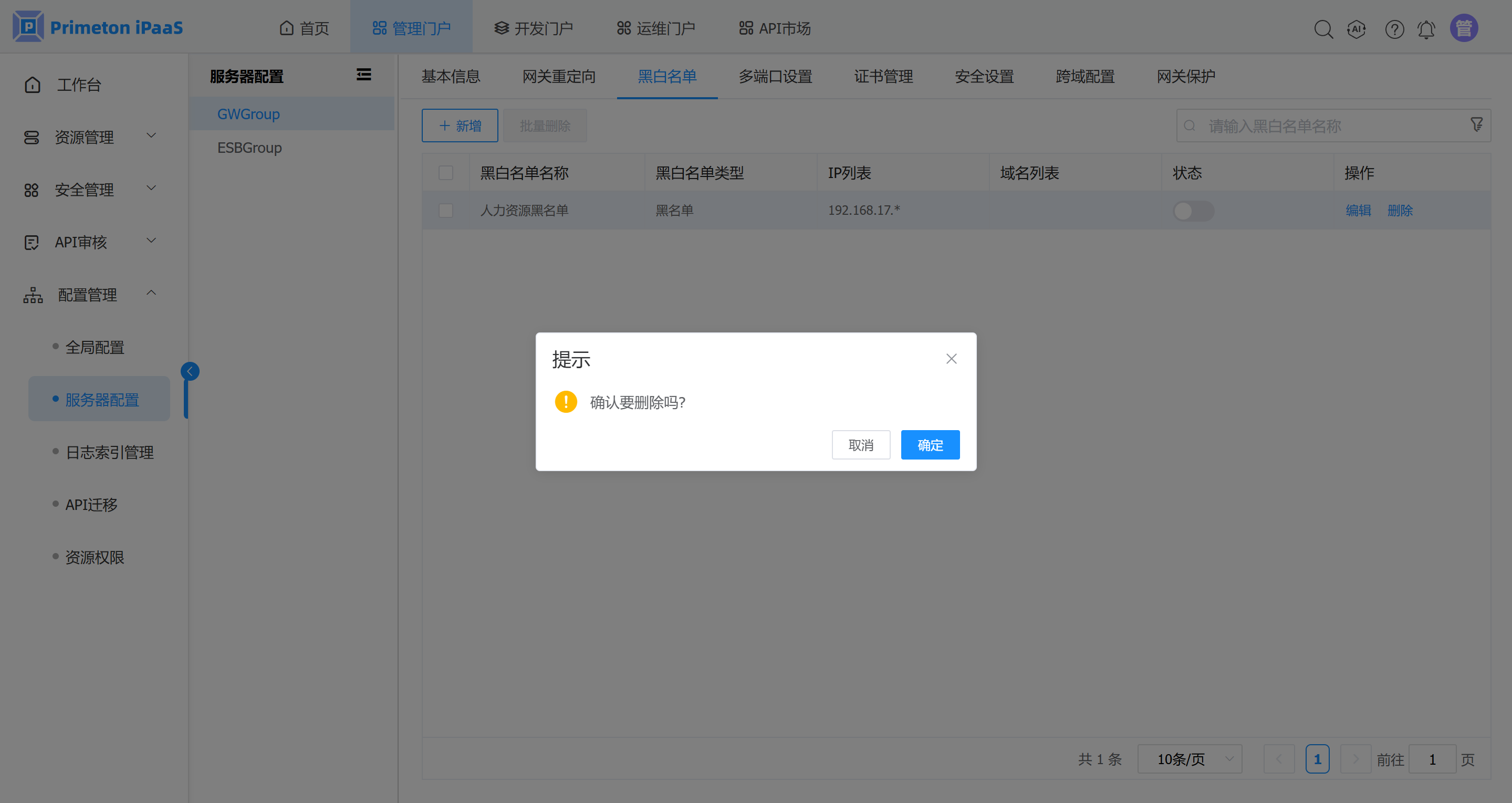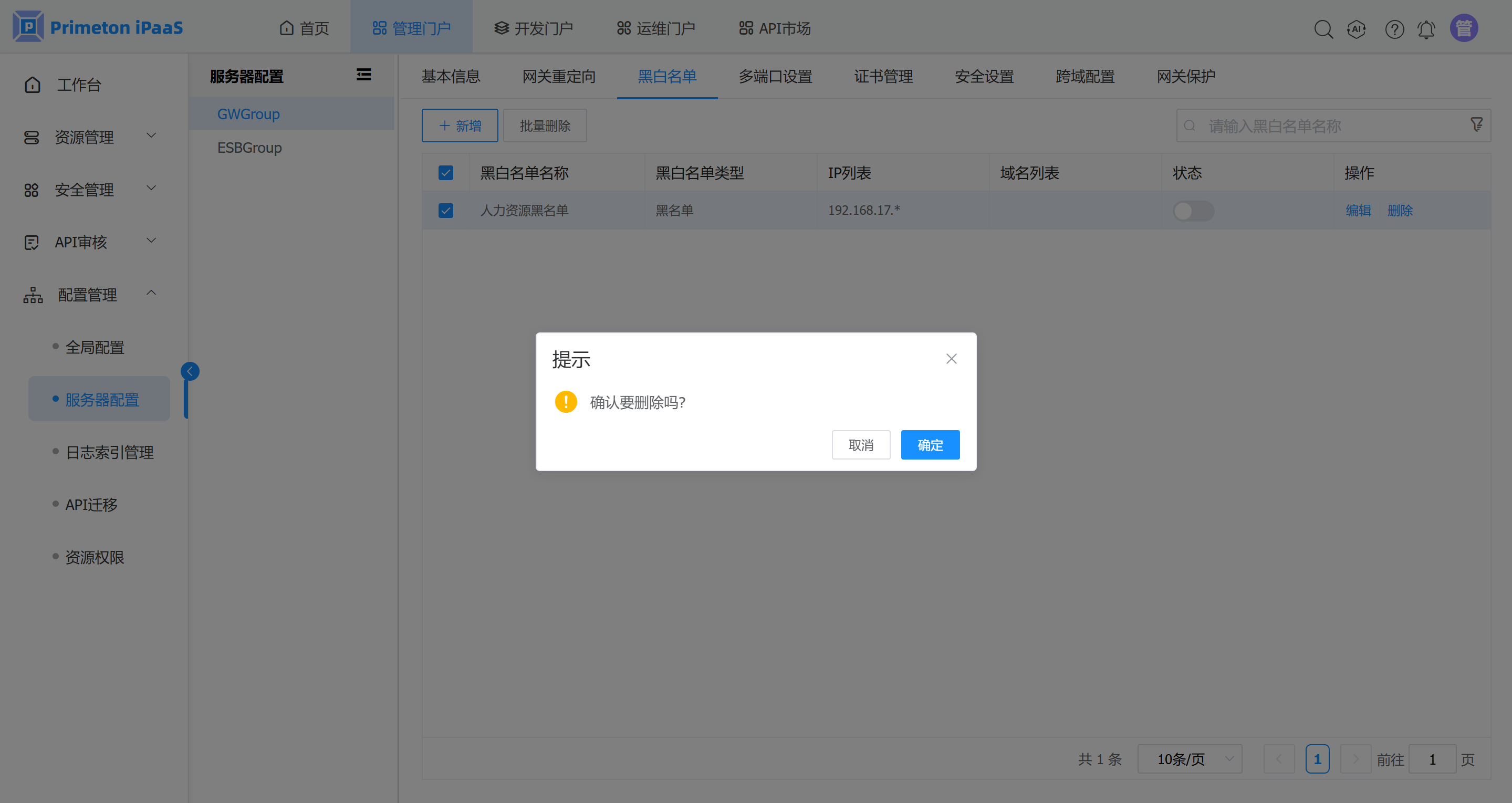 1. 在“黑白名单”页签,选择一条黑白名单记录,点击操作列”删除“按钮,弹出删除确认页面。