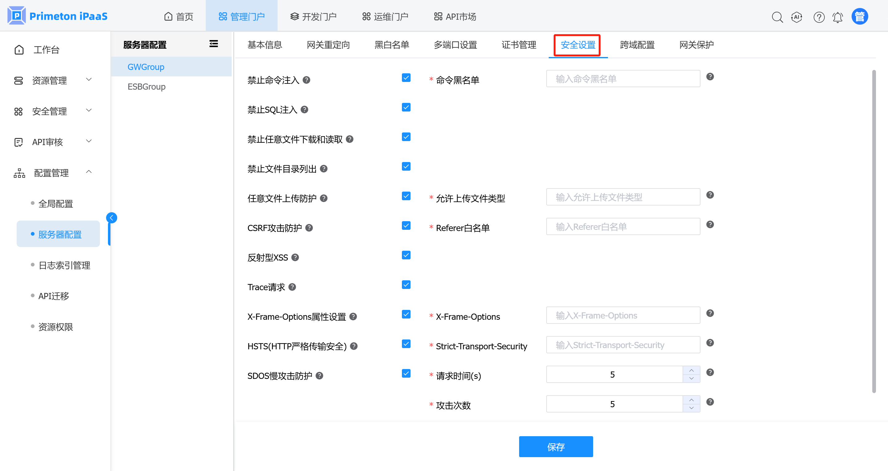 1. “服务器配置”页面,选择类型为“Gateway”的服务器组,进入“安全设置”页签,主要包括以下配置: