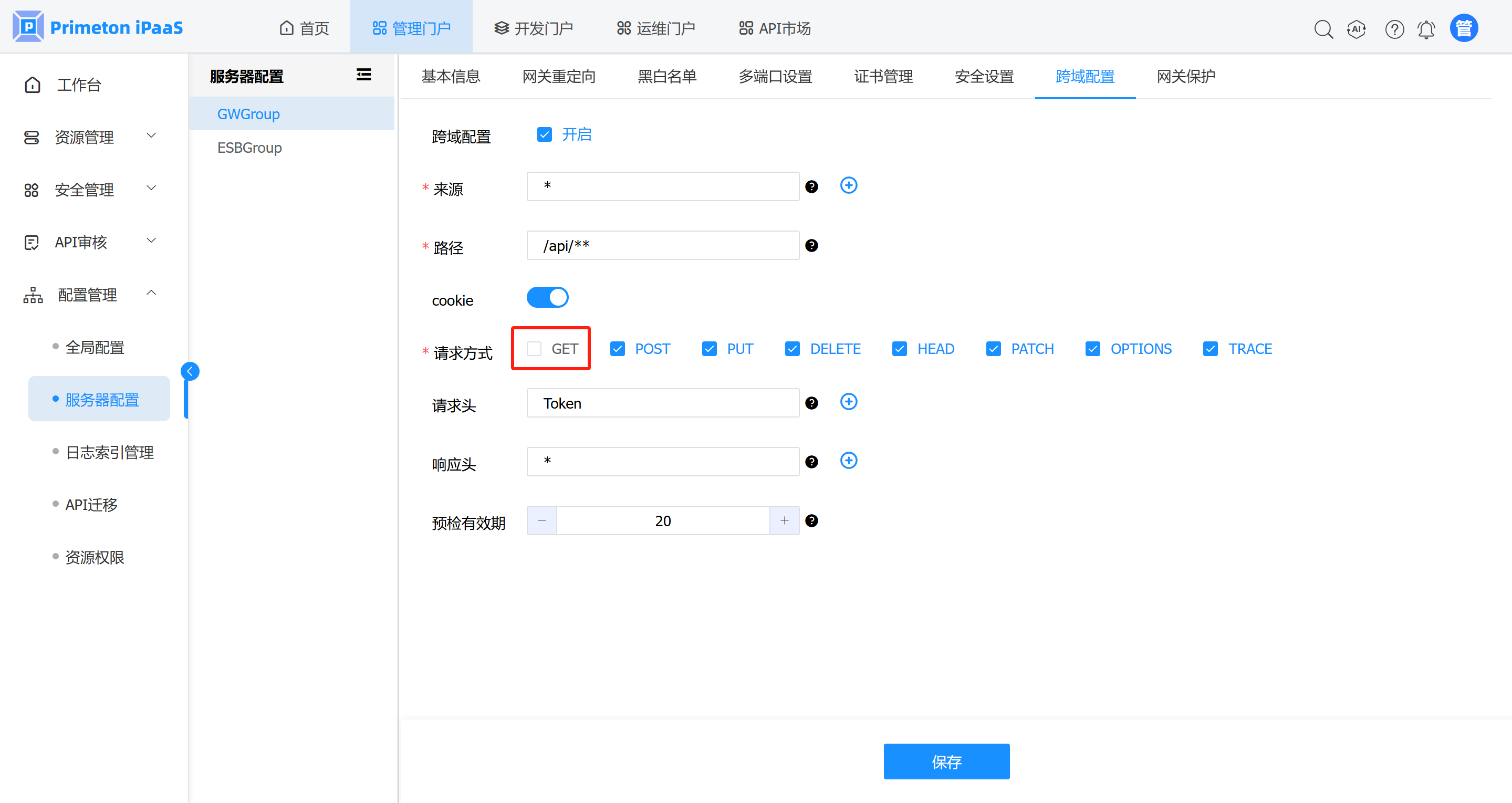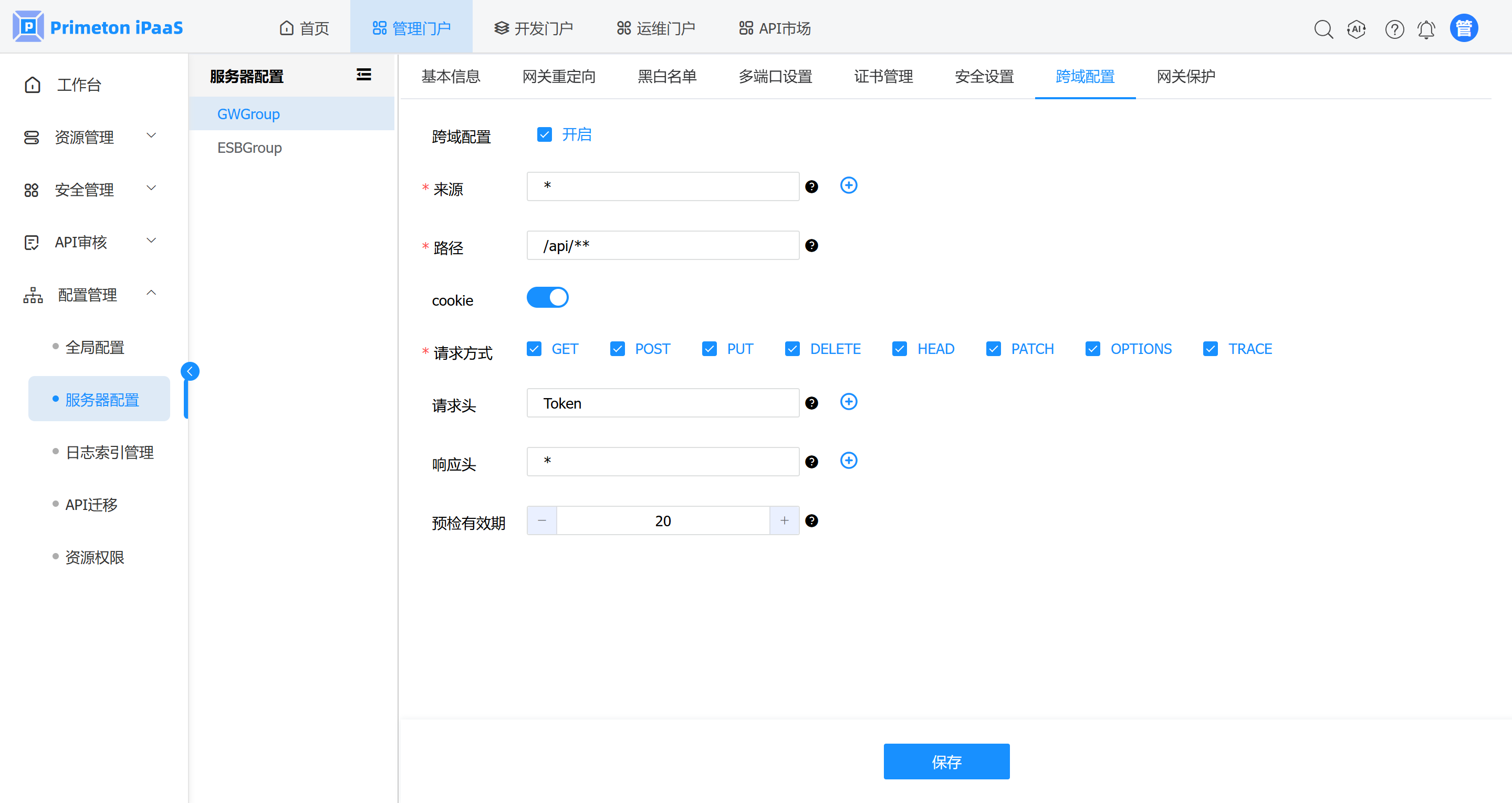 1. “服务器配置”页面,选择类型为“Gateway”的服务器组,进入“跨域配置”页签,进入跨域配置管理页面。