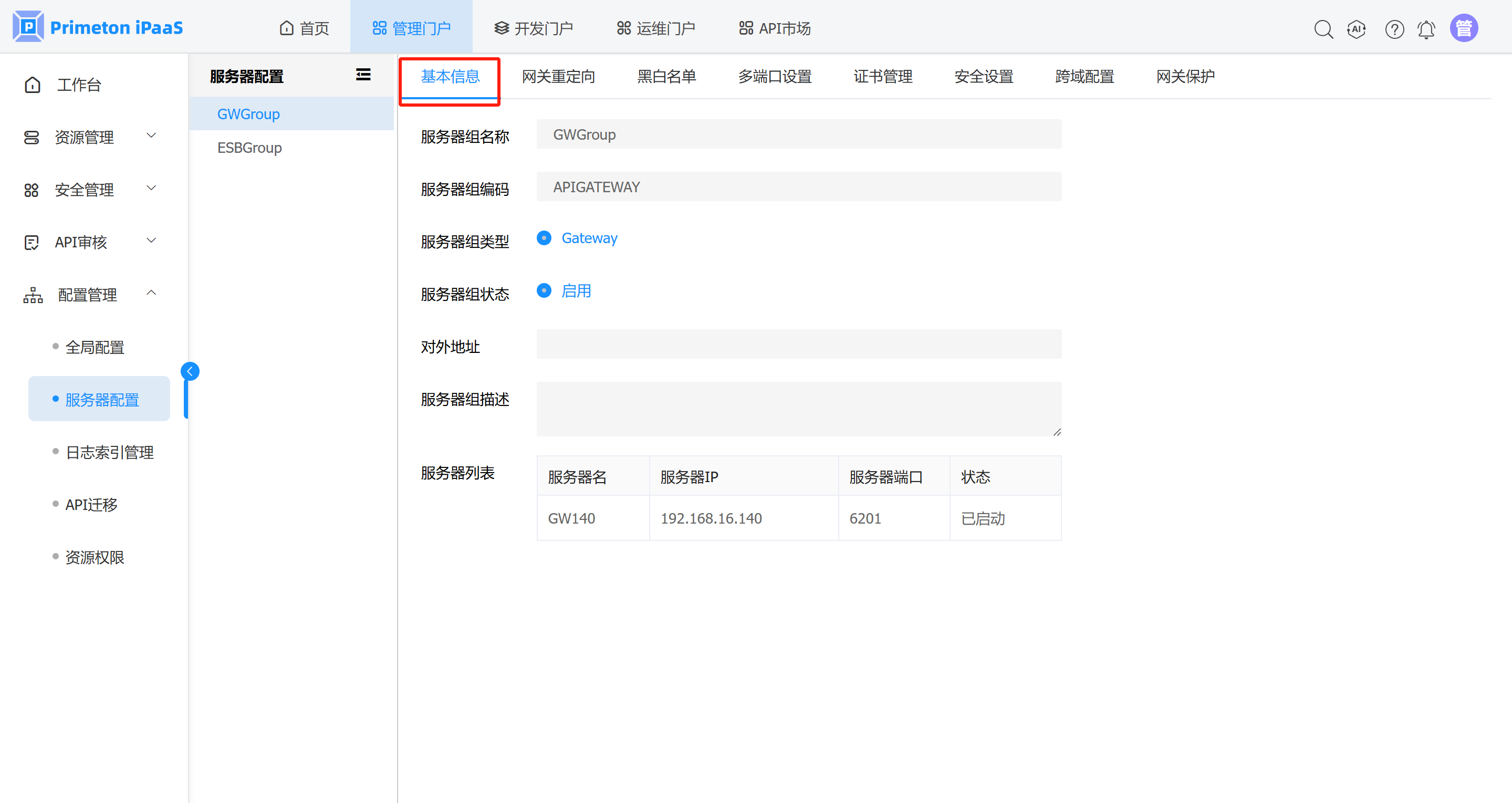1. “服务器配置”页面,选择类型为“Gateway”的服务器组,进入“基本信息”页签,显示该服务器组的基本信息。