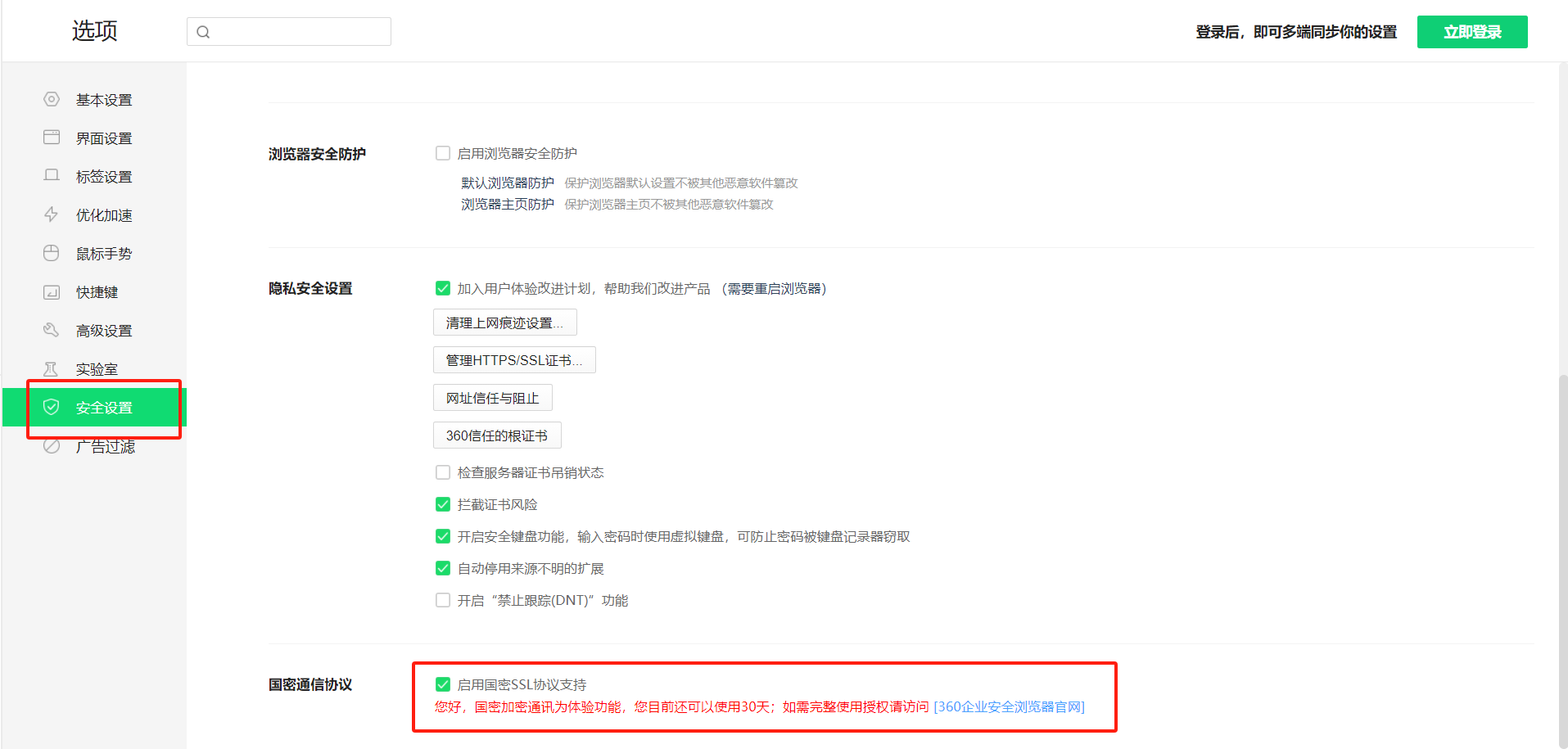通过证书配置可以更改网关支持的协议,从而进一步保证信息传输安全,当前网关服务器同时支持标准SSL协议以及国密SSL协议,此处展示标准https证书的配置及效果