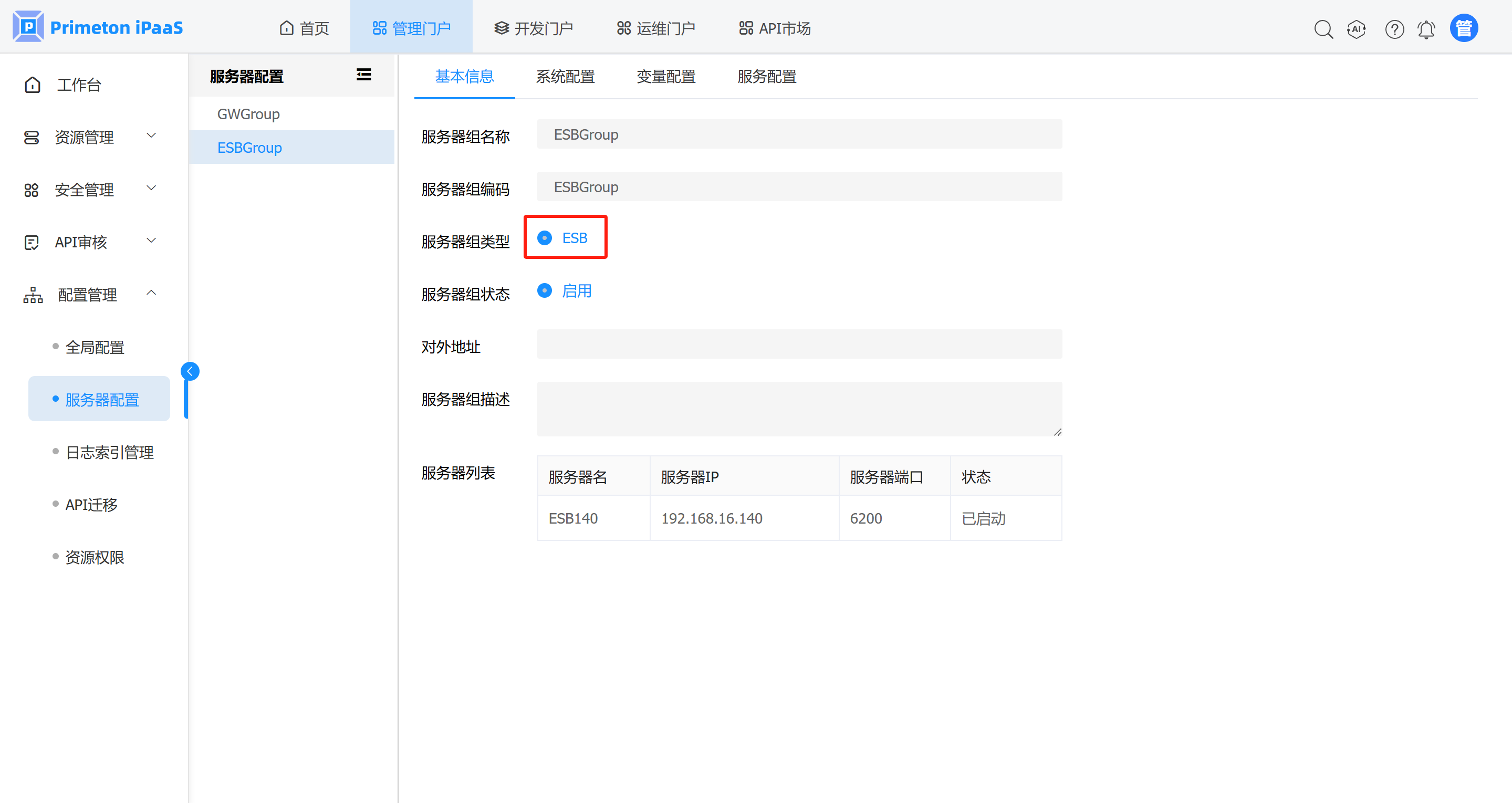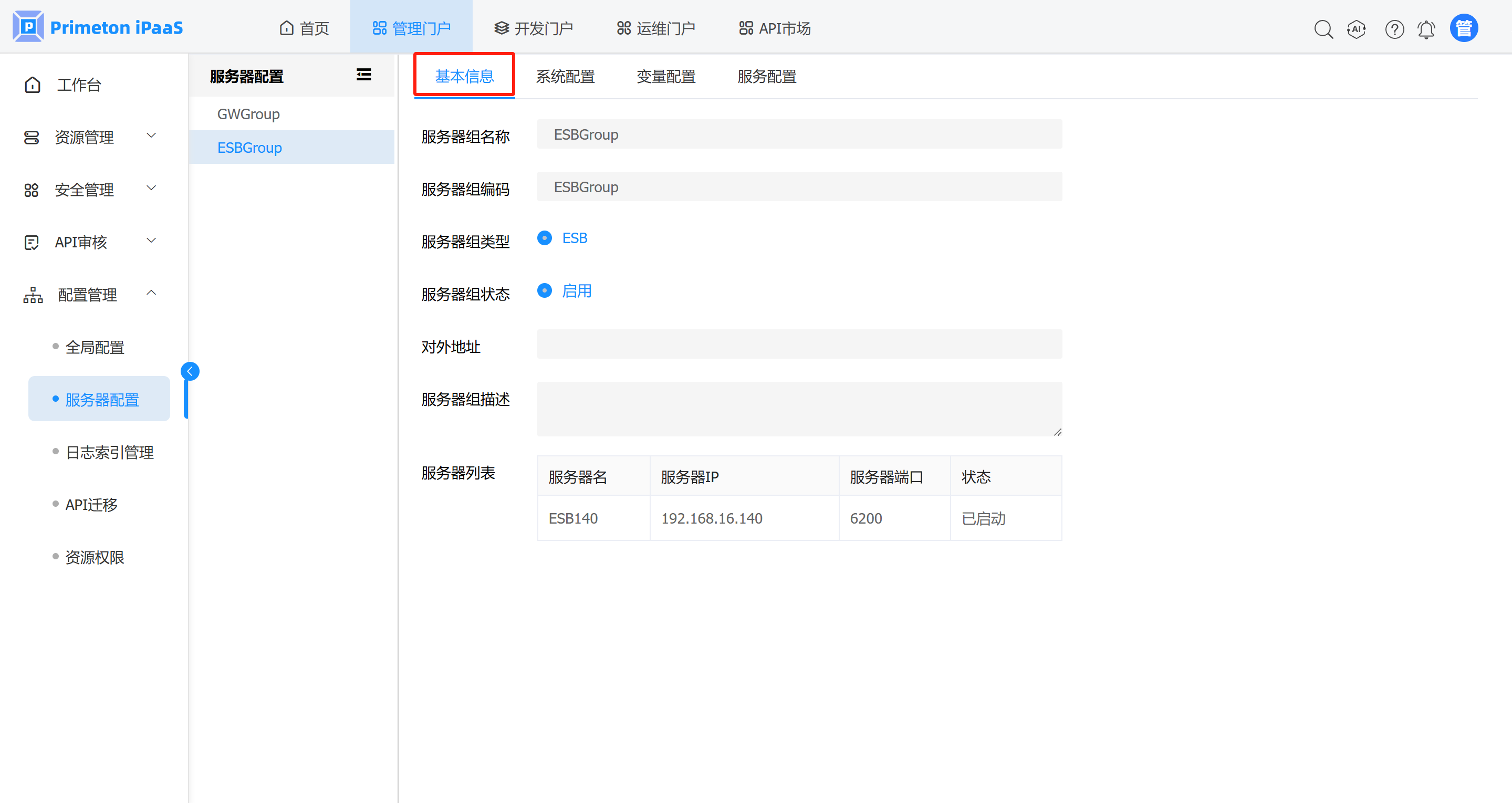 管理人员登录系统,进入管理门户,点击菜单“配置管理”>“服务器配置”,选择类型为“ESB”的服务器组,页面展示当前服务器组“基础信息”、“系统配置”、“变量配置”、“服务配置”信息。