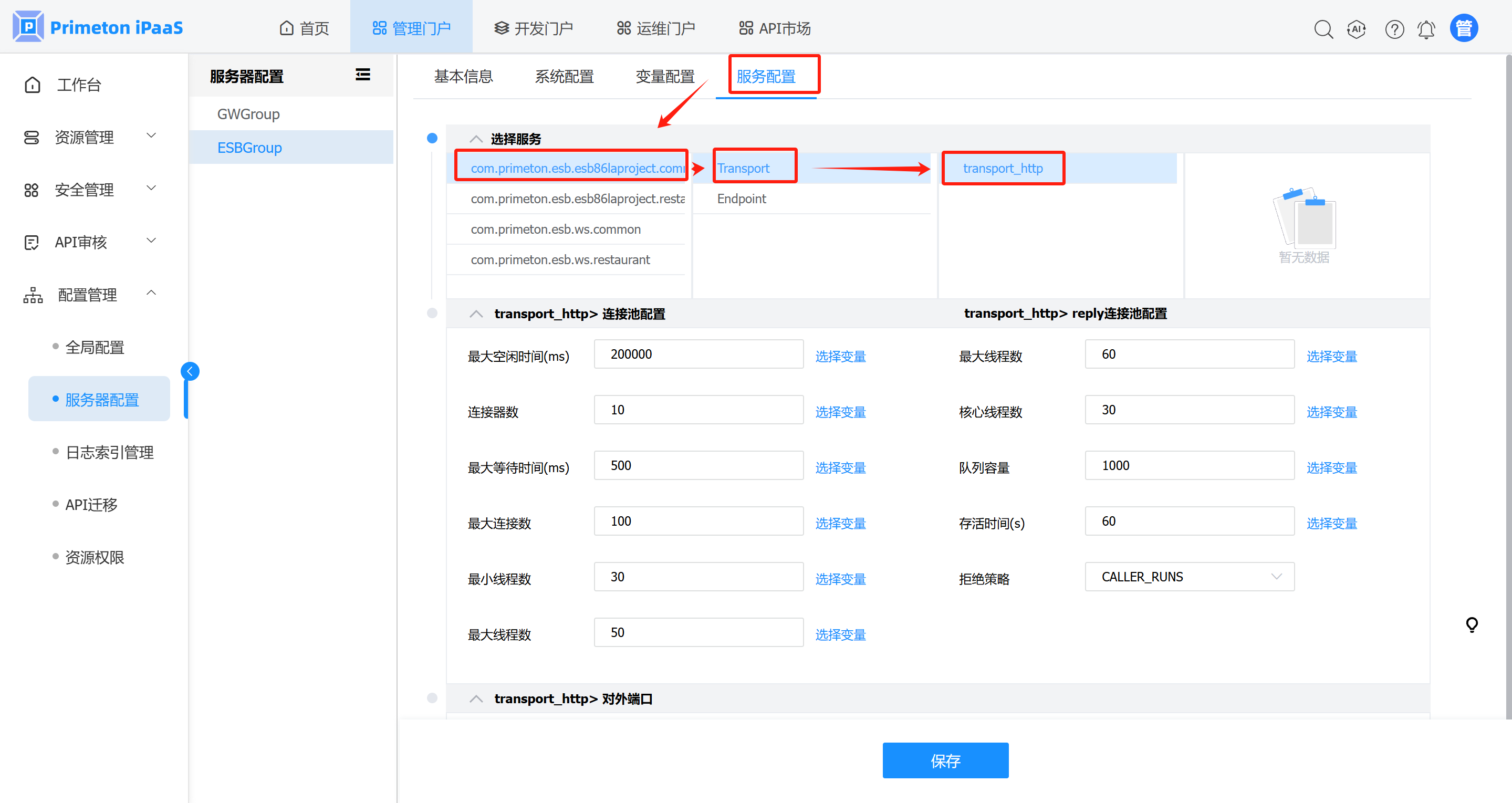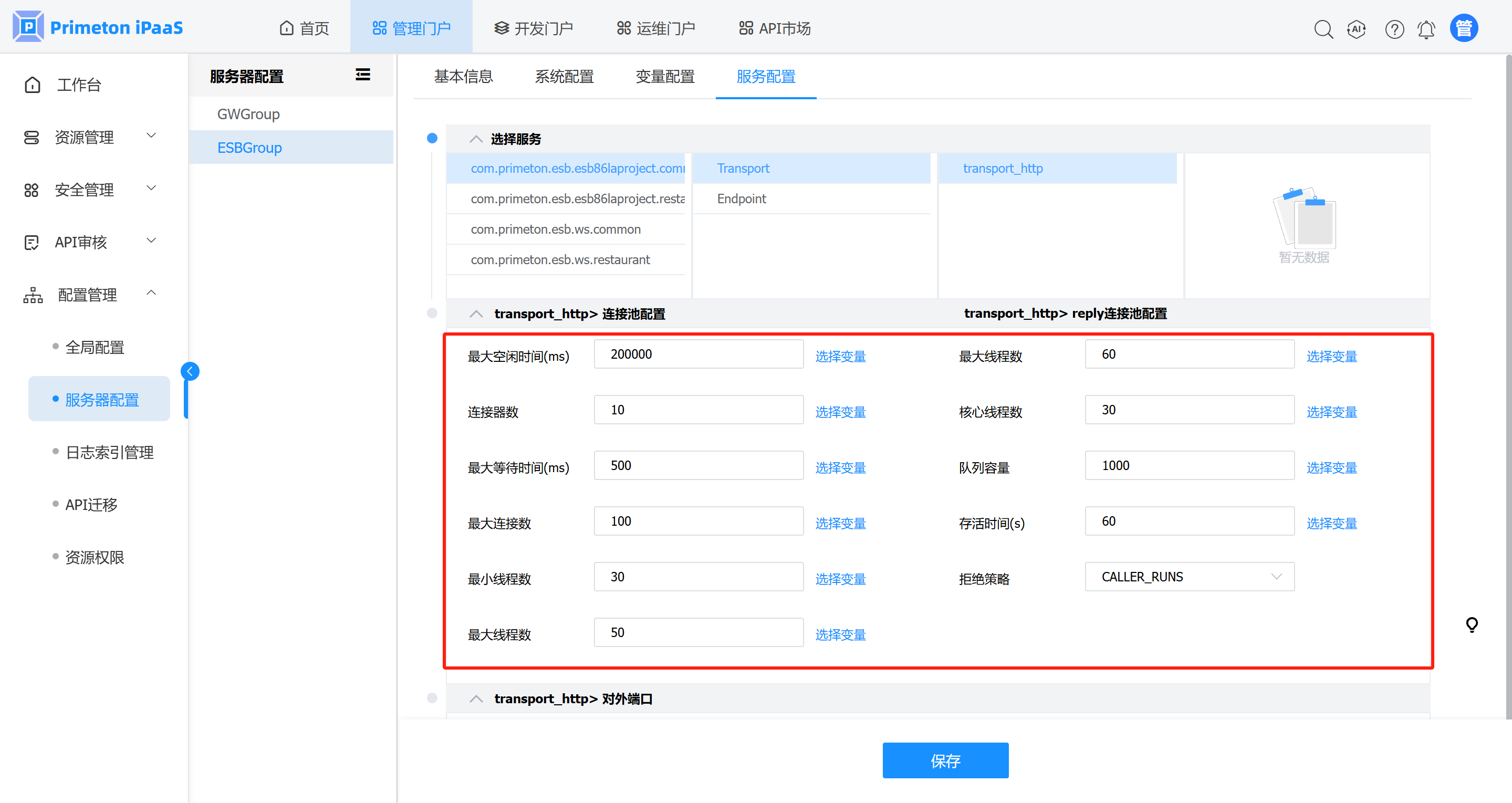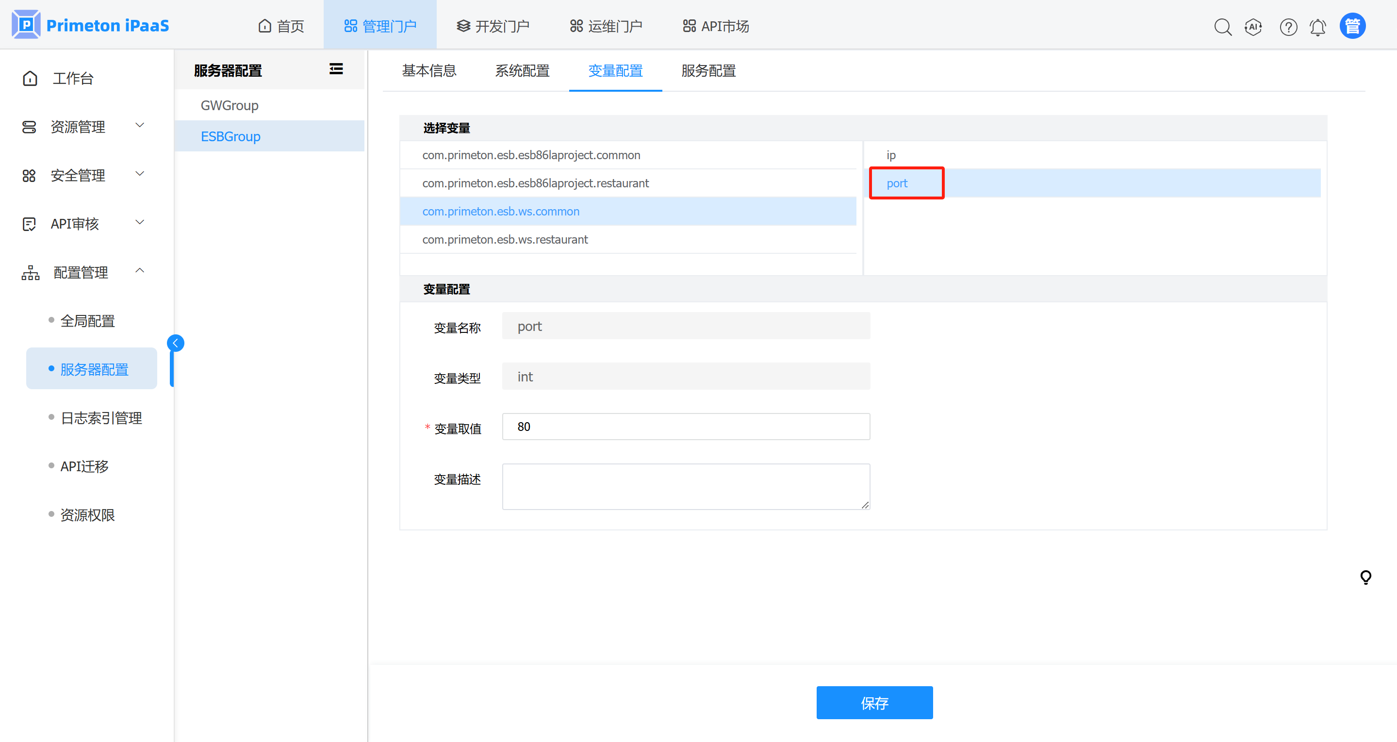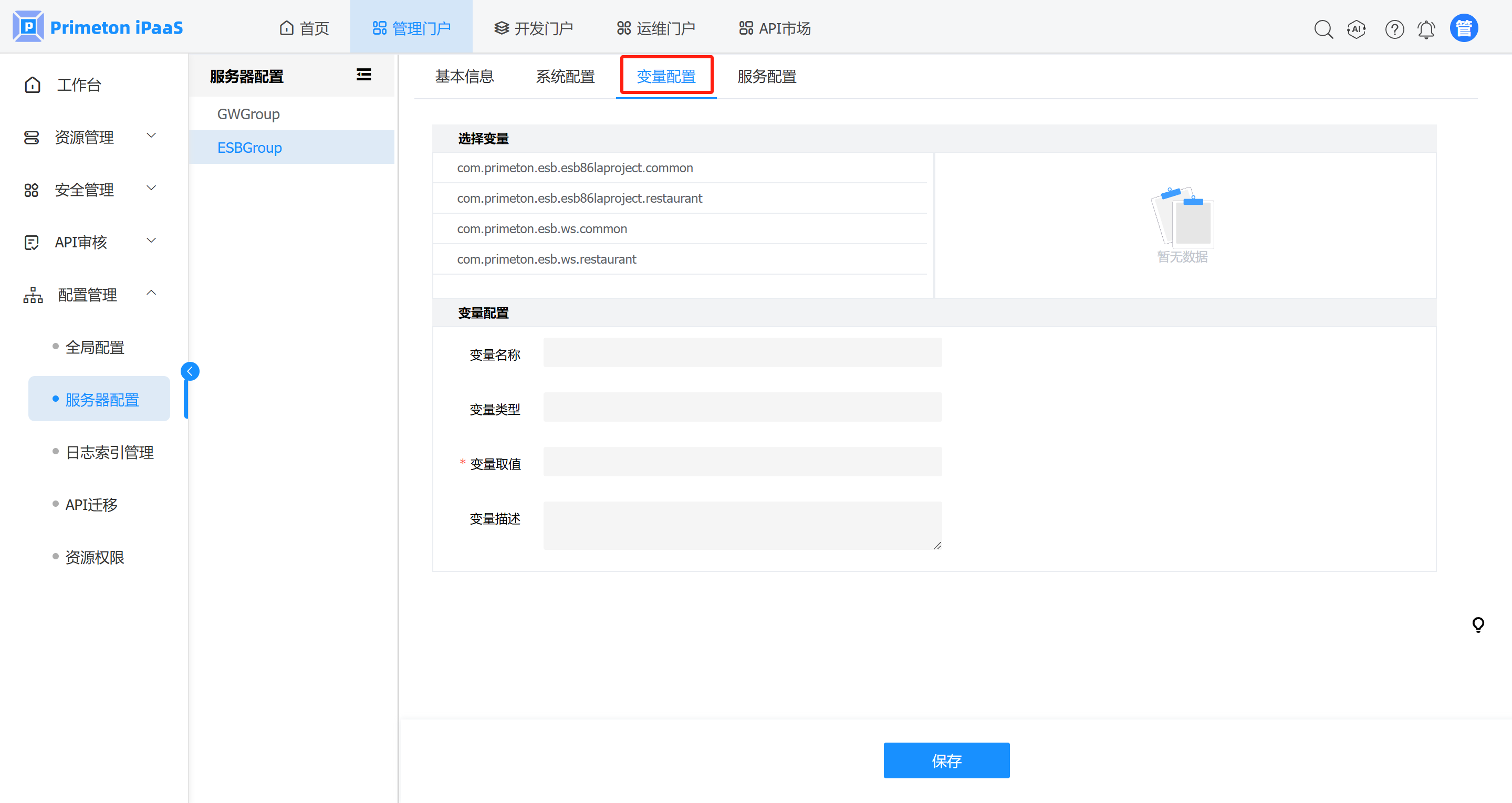“服务器配置”页面,选择类型为“ESB”的服务器组,进入“变量配置”页签,进入“变量配置 ” 界面。
