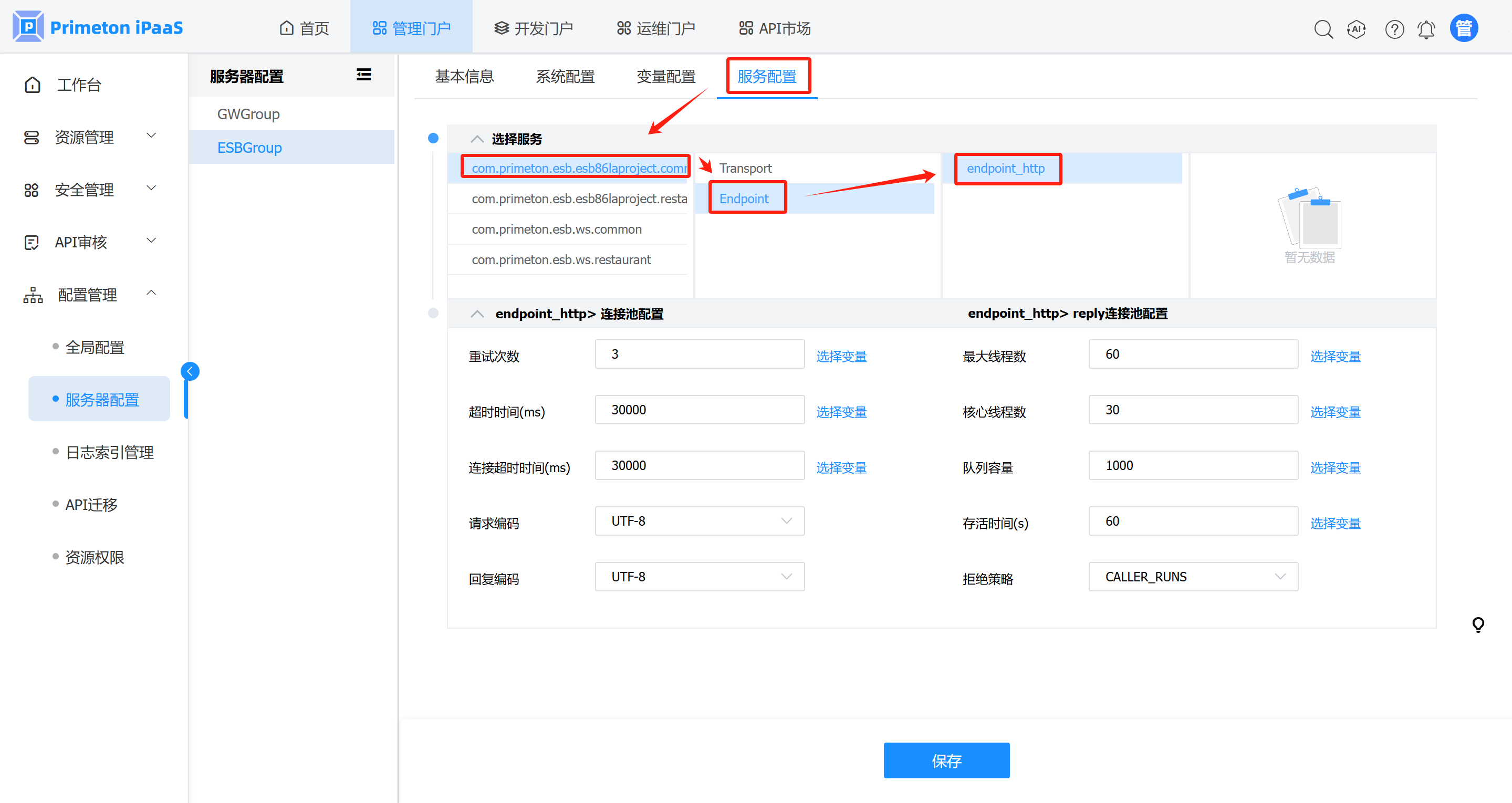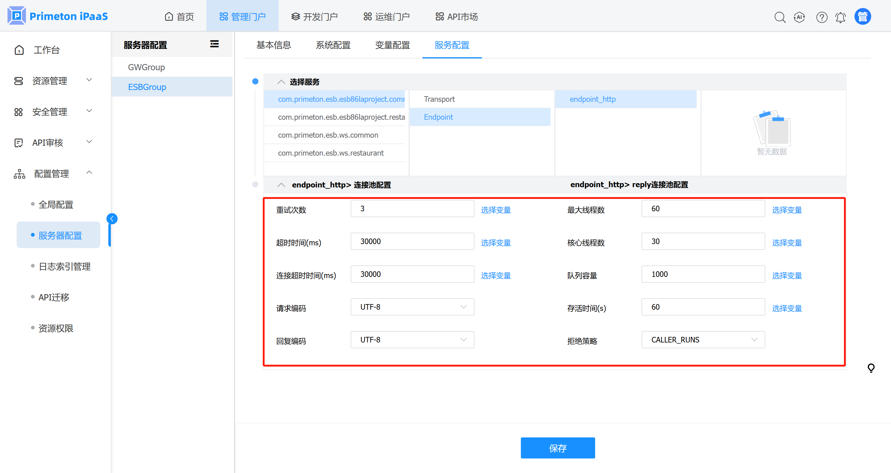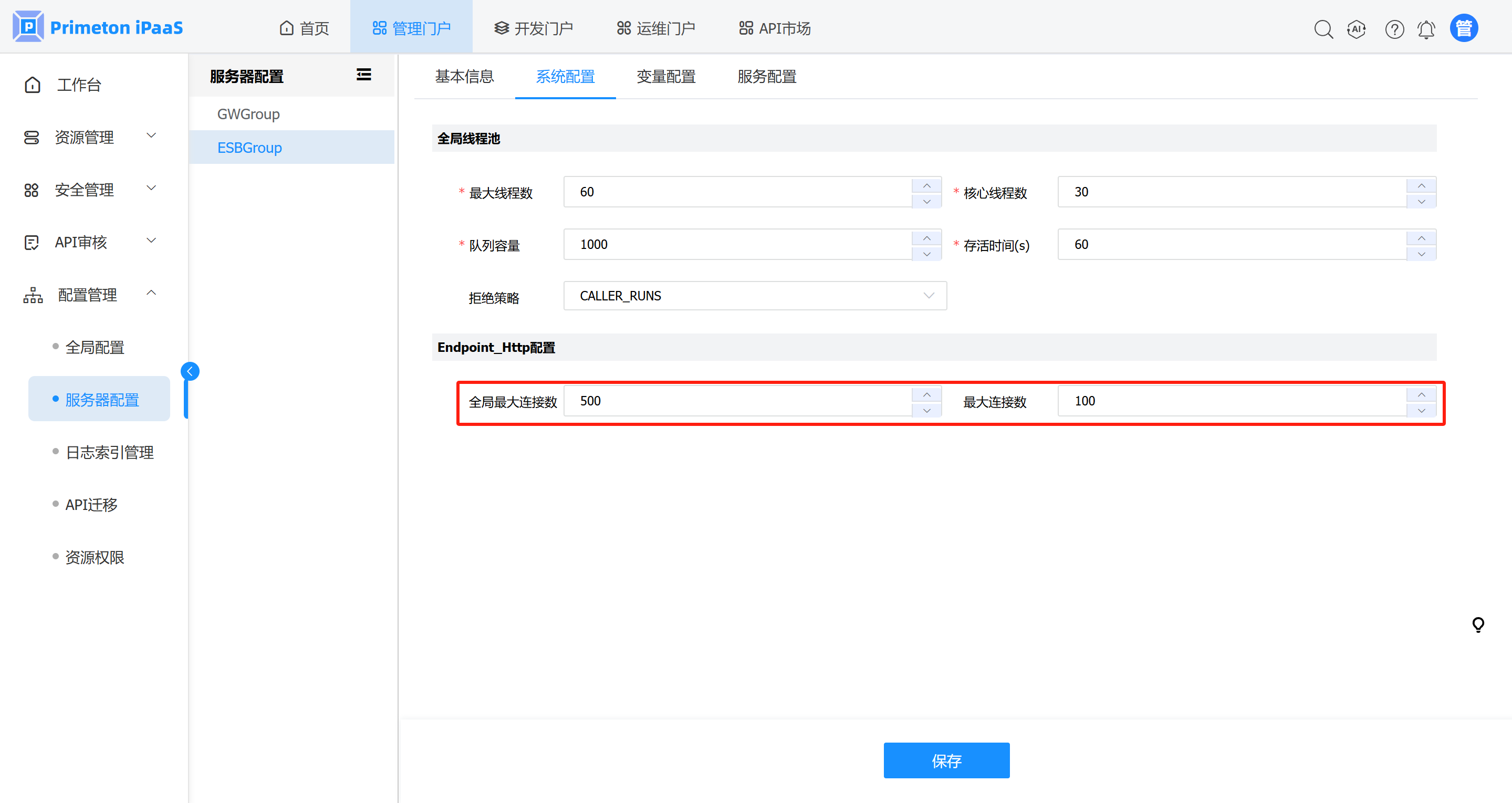 “服务器配置”页面,选择类型为“ESB”的服务器组,进入“系统配置”页签,在“Endpoint_Http配置”区域修改相关数据,如下图所示: