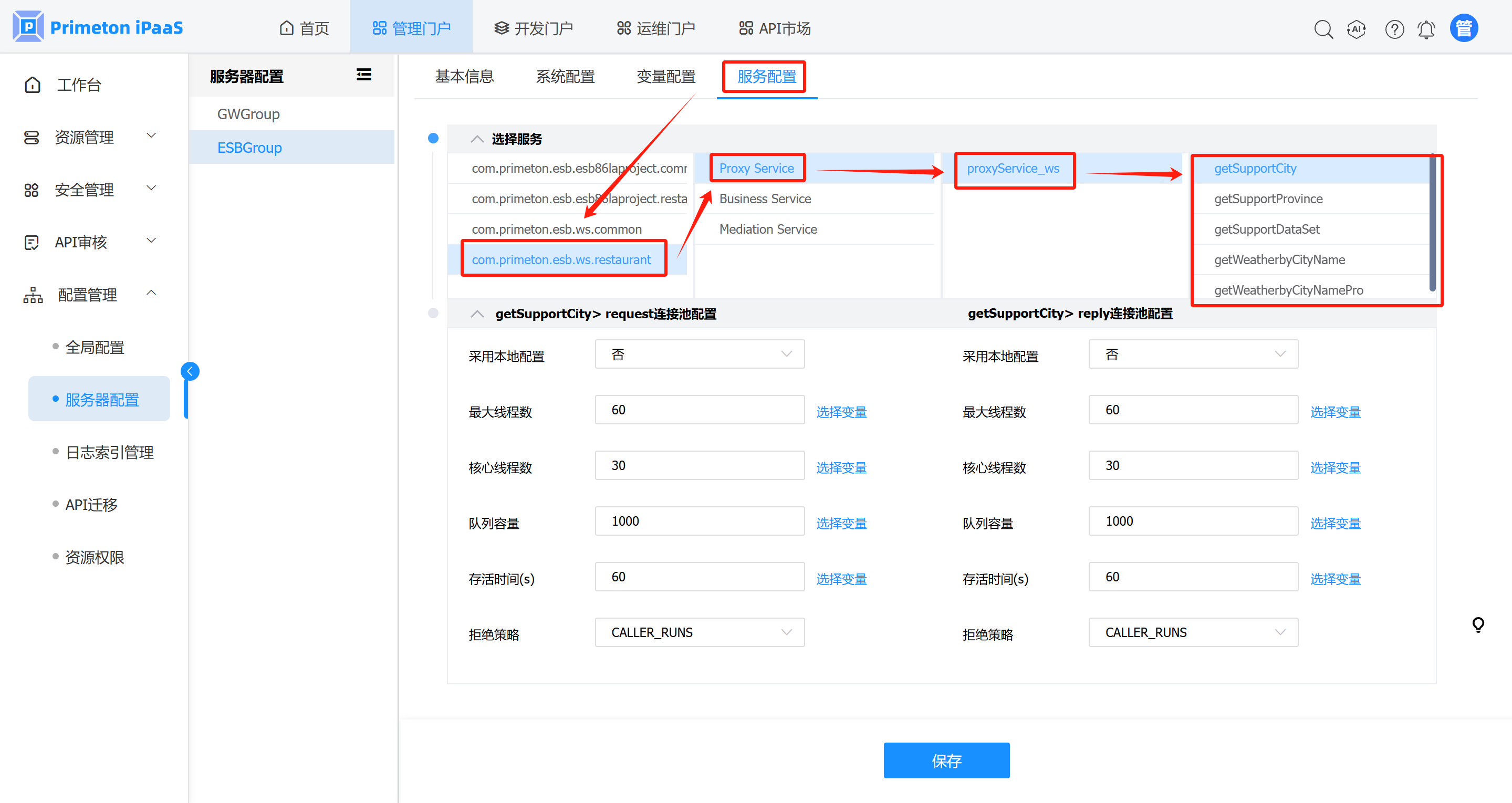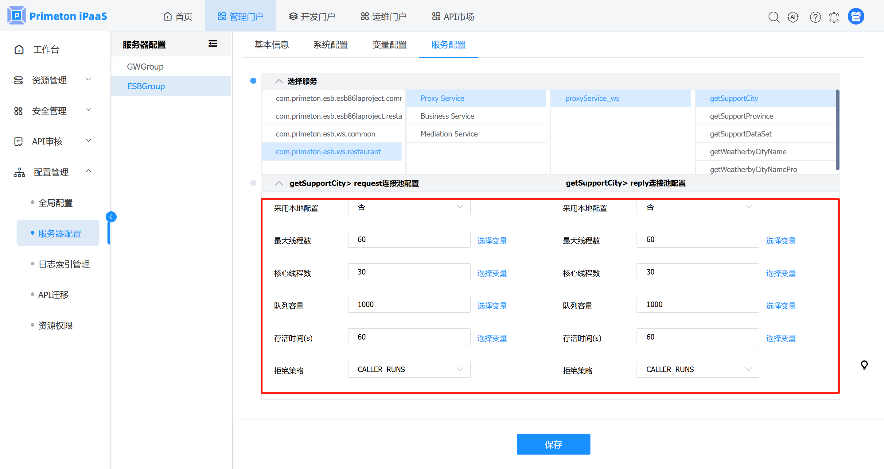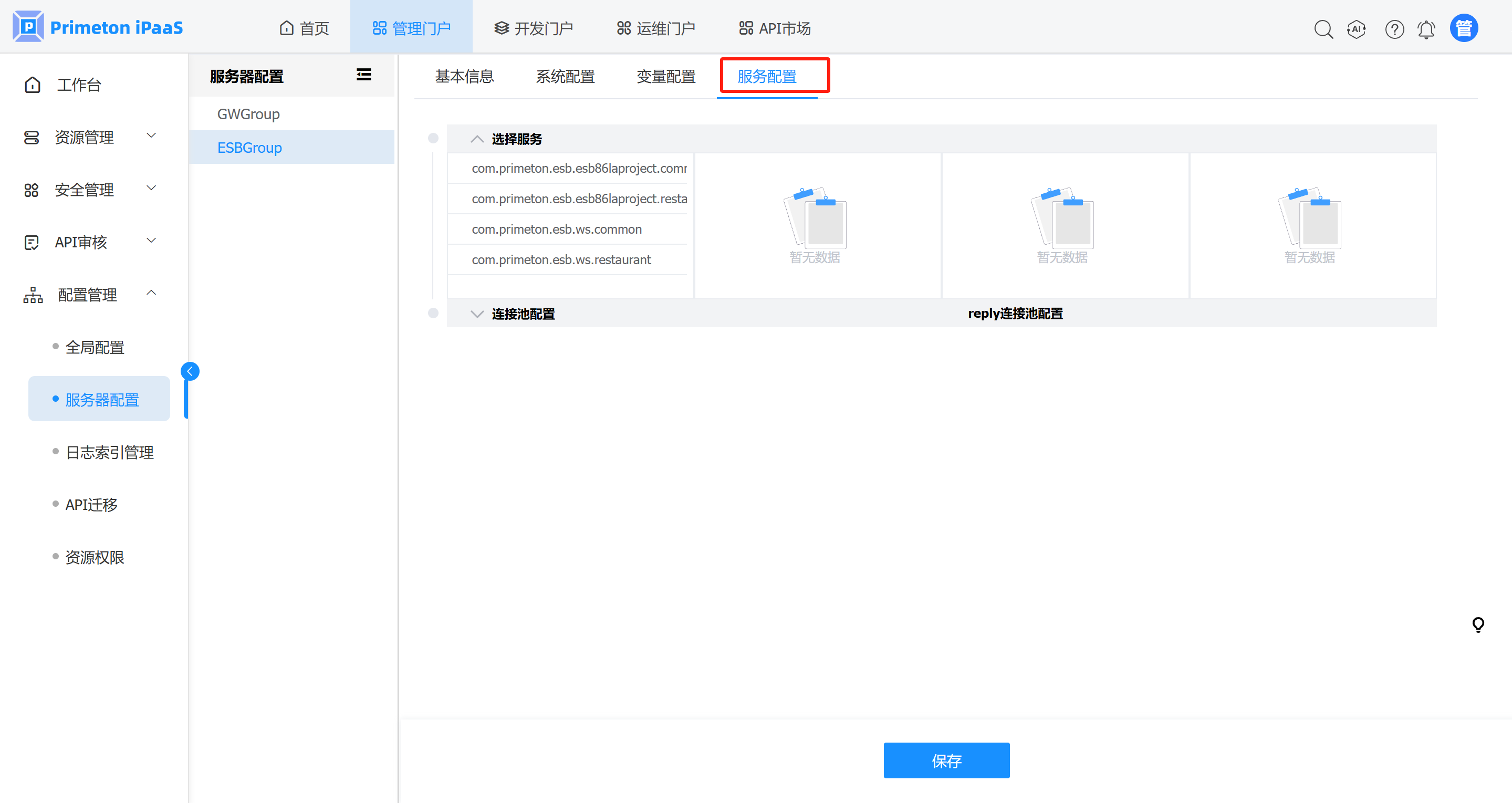 “服务器配置”页面,选择类型为“ESB”的服务器组,进入“服务配置”页签,进入“服务配置 ” 界面。