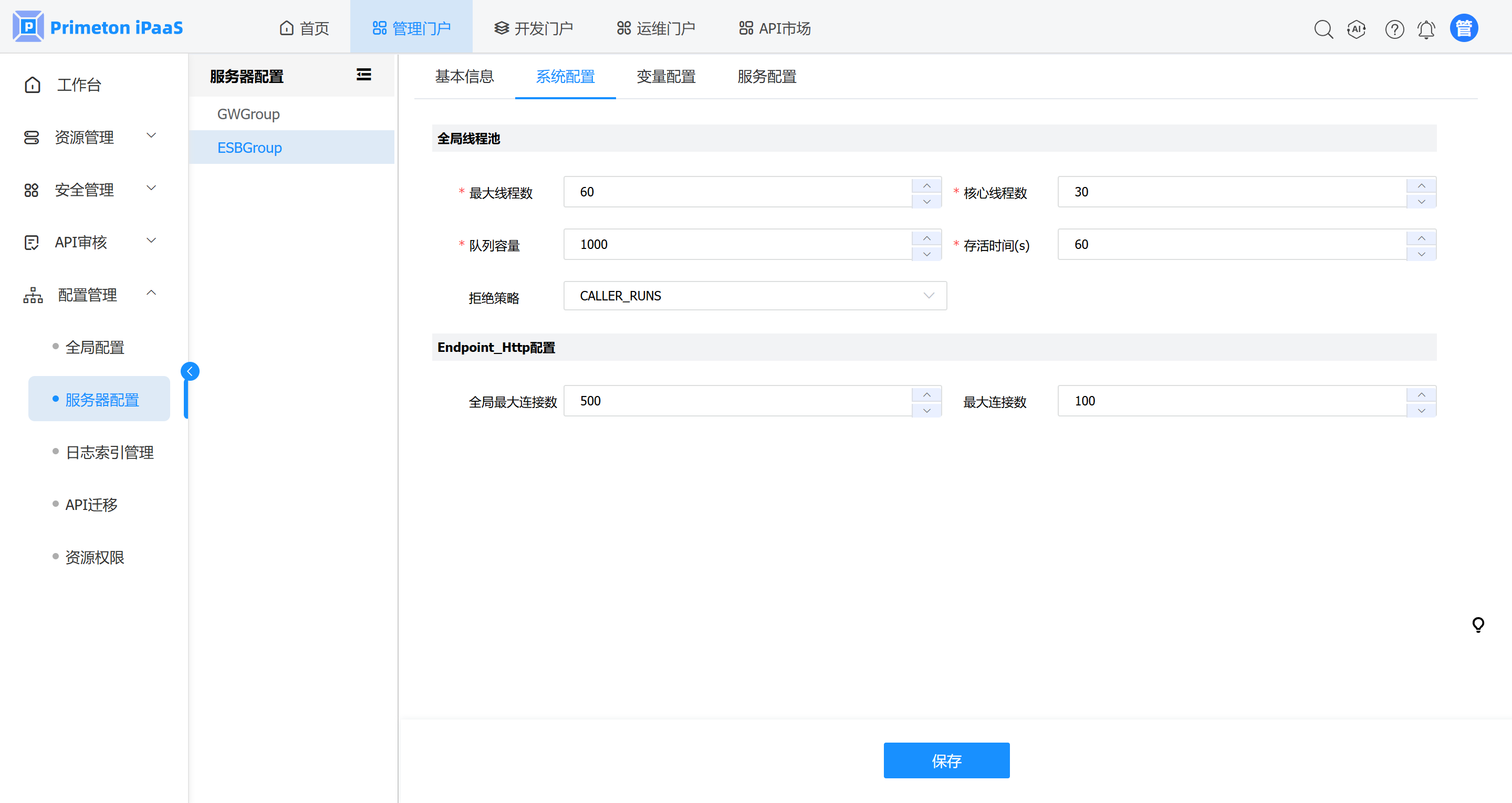 - “服务器配置”页面,选择类型为“ESB”的服务器组,进入“系统配置”页签,展示“系统配置”界面,如下图所示: