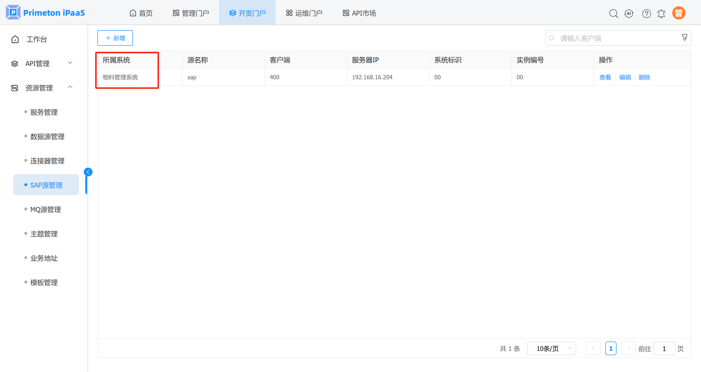 - 开发人员登录系统,进入开发门户,点击菜单“资源管理”>”SAP源管理“,进入SAP源管理界面,查验SAP源所属系统。