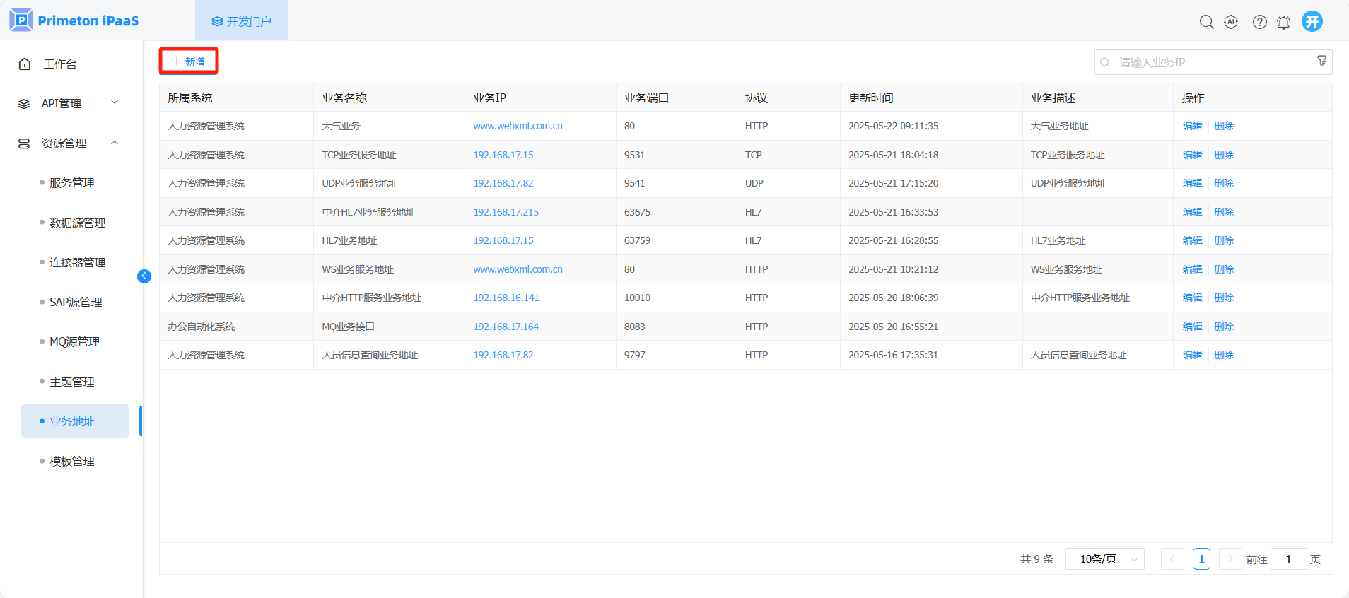 开发人员登录系统,进入开发门户, 点击菜单“资源管理“ >”业务地址” ,右侧区域显示 “业务地址” 界面。