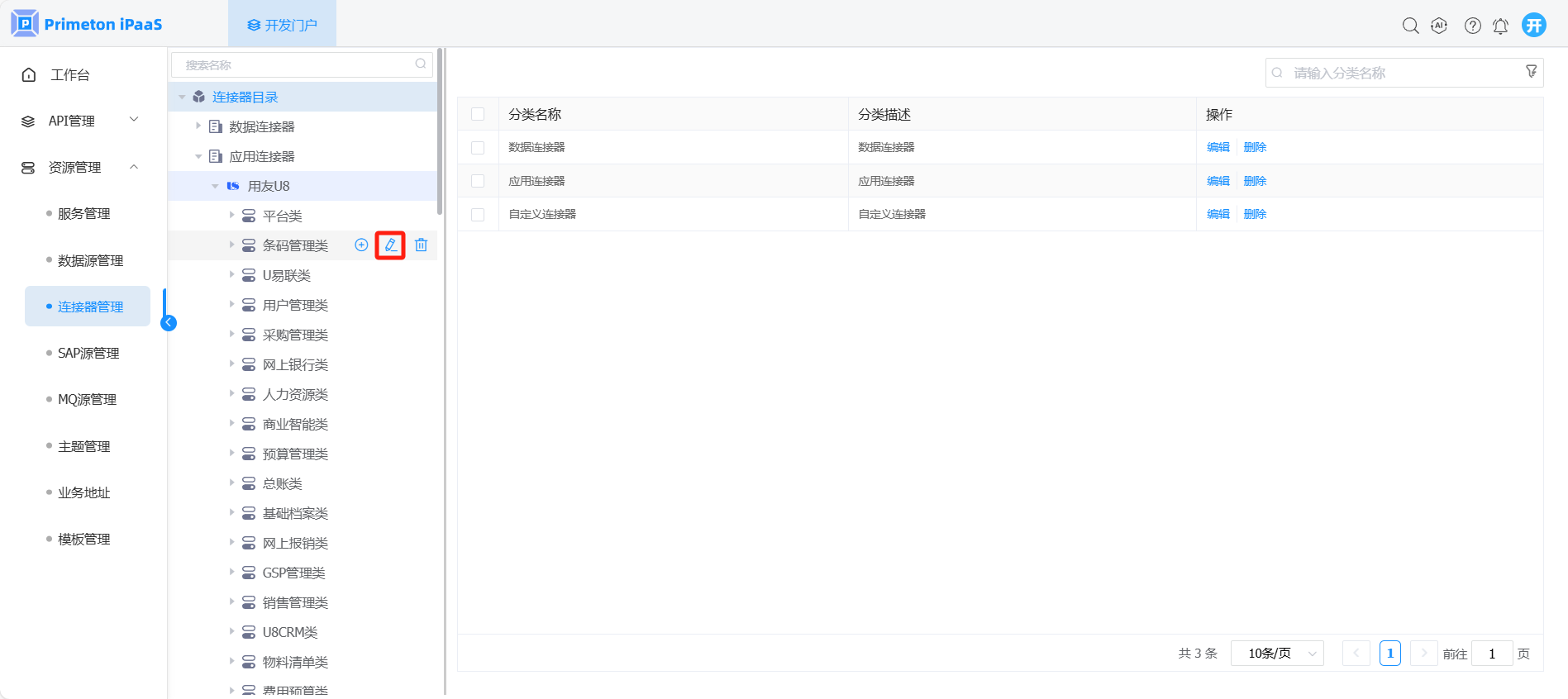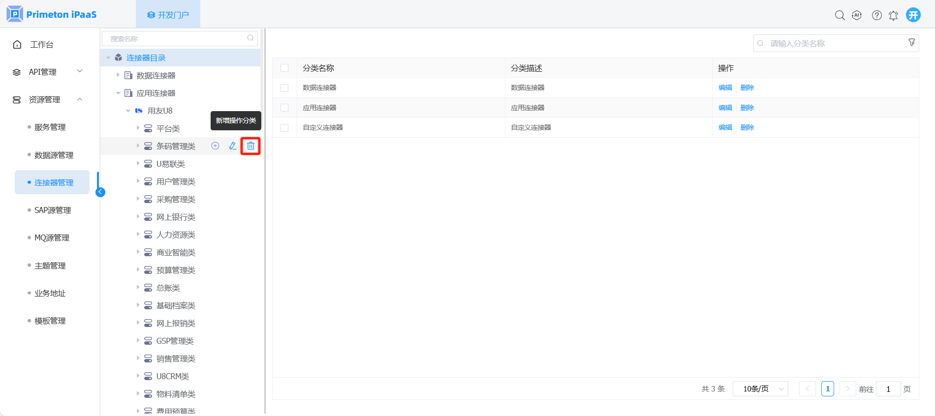 开发人员登录系统,进入开发门户,点击菜单“资源管理“ >“连接器管理” ,右侧区域显示 “连接器管理”界面。