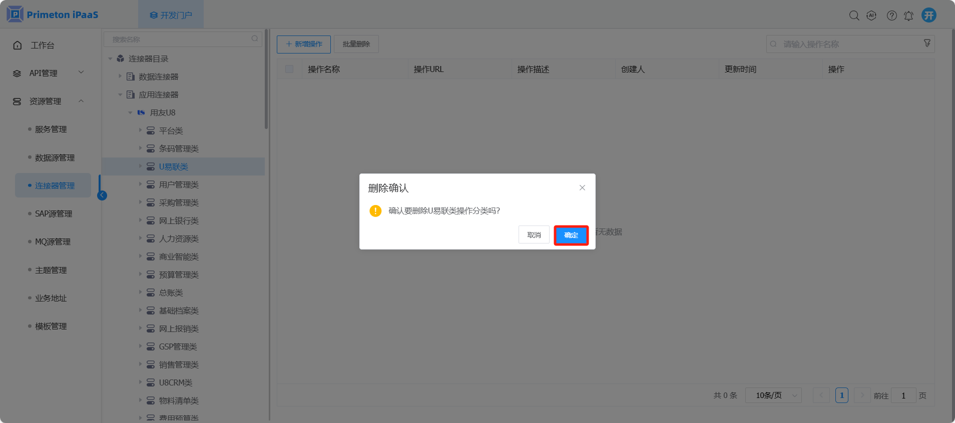鼠标悬浮于左侧树的需要删除操作分类节点上,点击删除按钮,弹出该操作分类的删除确认页面。