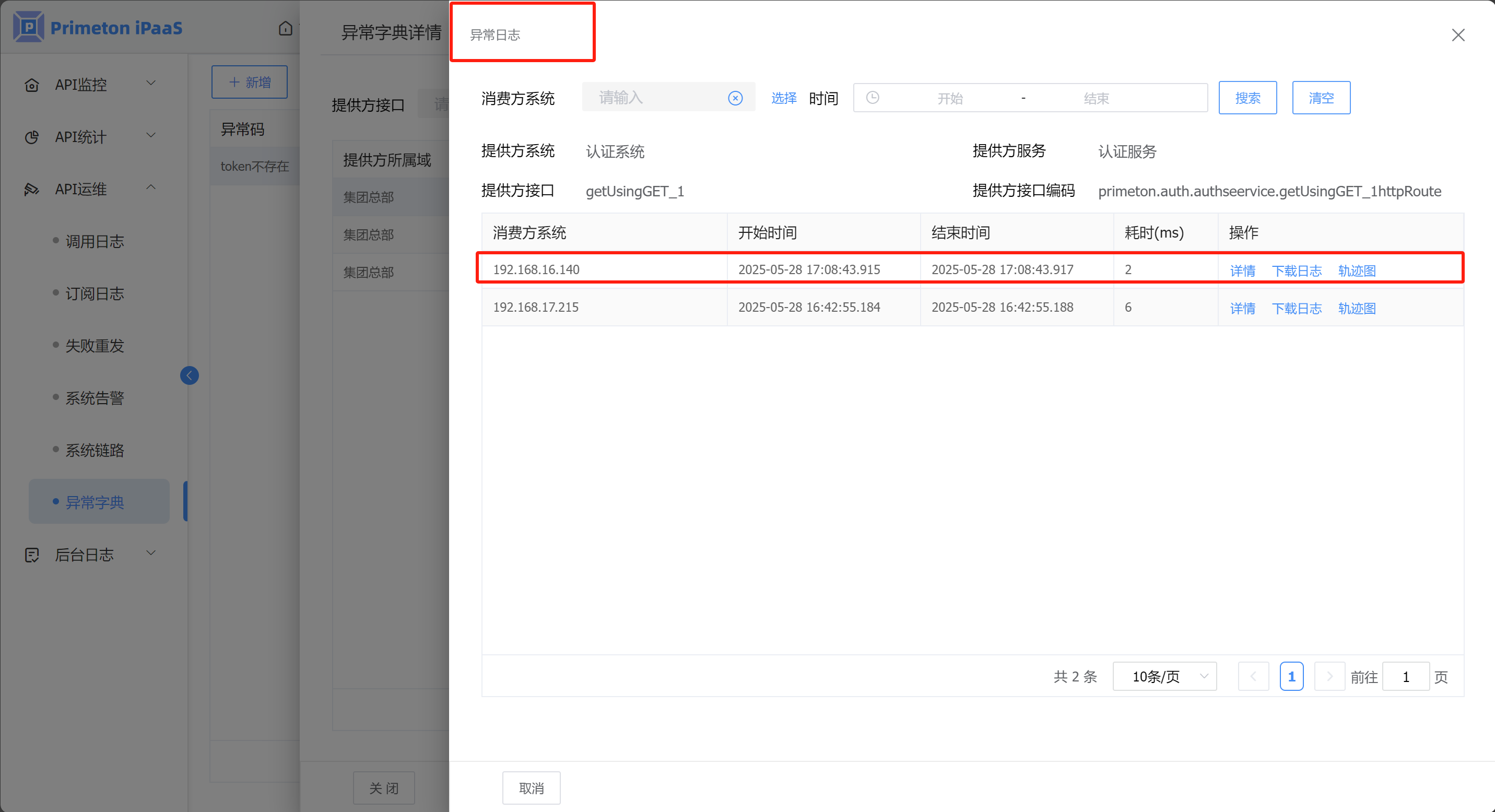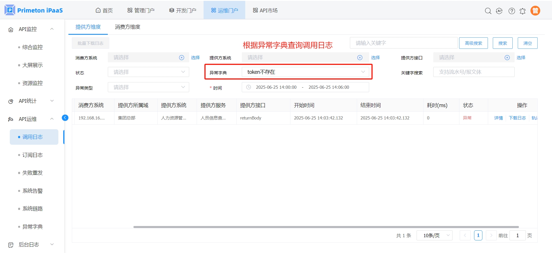 在“API运维->调用日志”查询调用日志时,可以根据异常字典查询异常日志。