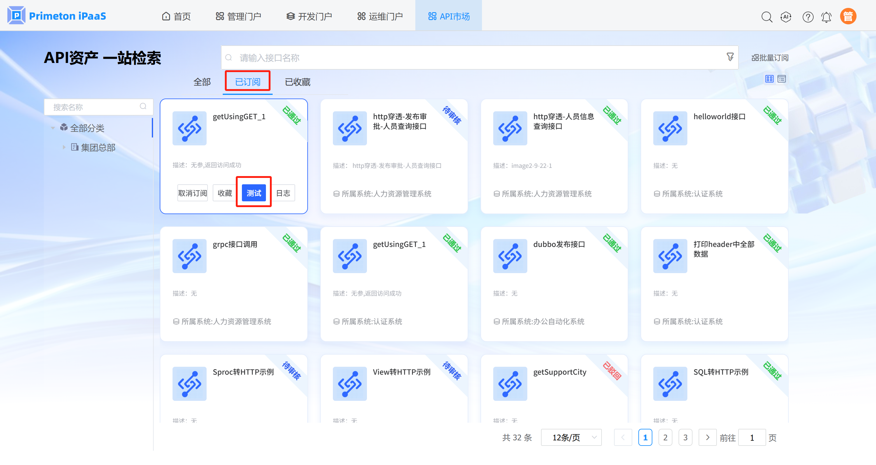 4.1 使用manager账号(默认密码:000000)登录系统,点击菜单“API市场”,选择”已订阅”页签,点击”测试”按钮,进入”测试”页面。如果没有订阅的接口, 请参考HTTP穿透(手动录入)文档进行API注册和订阅。