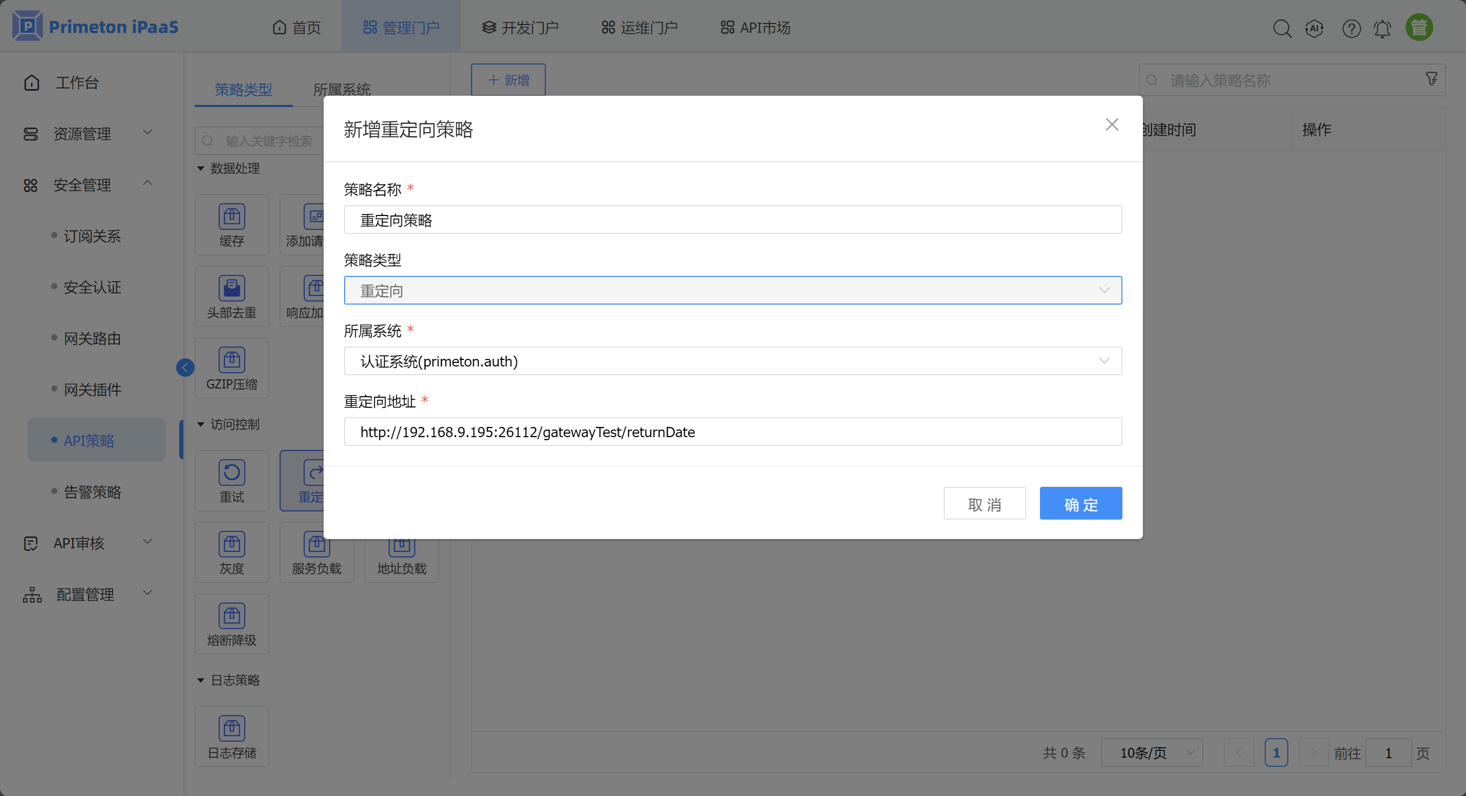 新增重定向策略,配置重定向路径为“http://192.168.9.195:26112/gatewayTest/returnDate”,