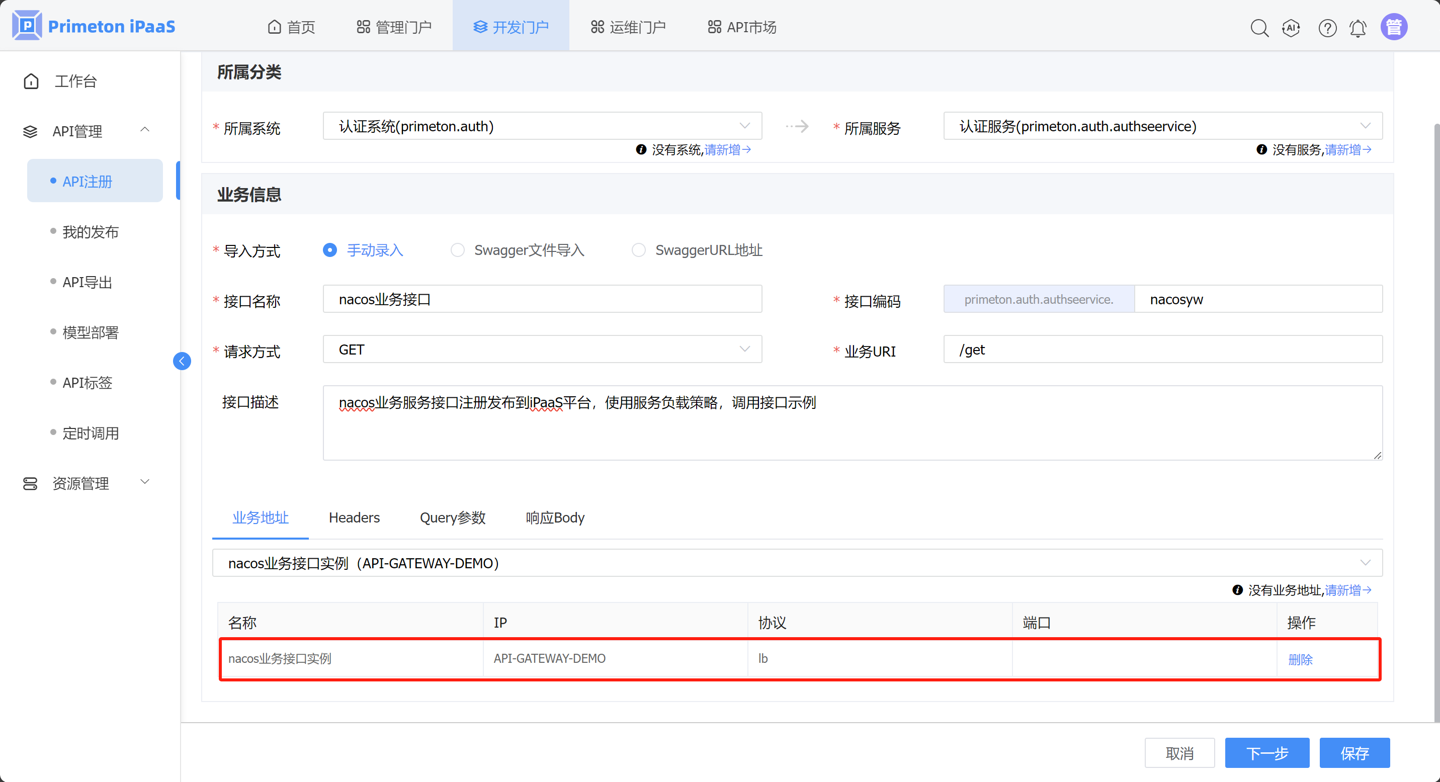 注意:nacos业务服务实例接口注册到iPaaS平台中,需使用lb协议,如下图: