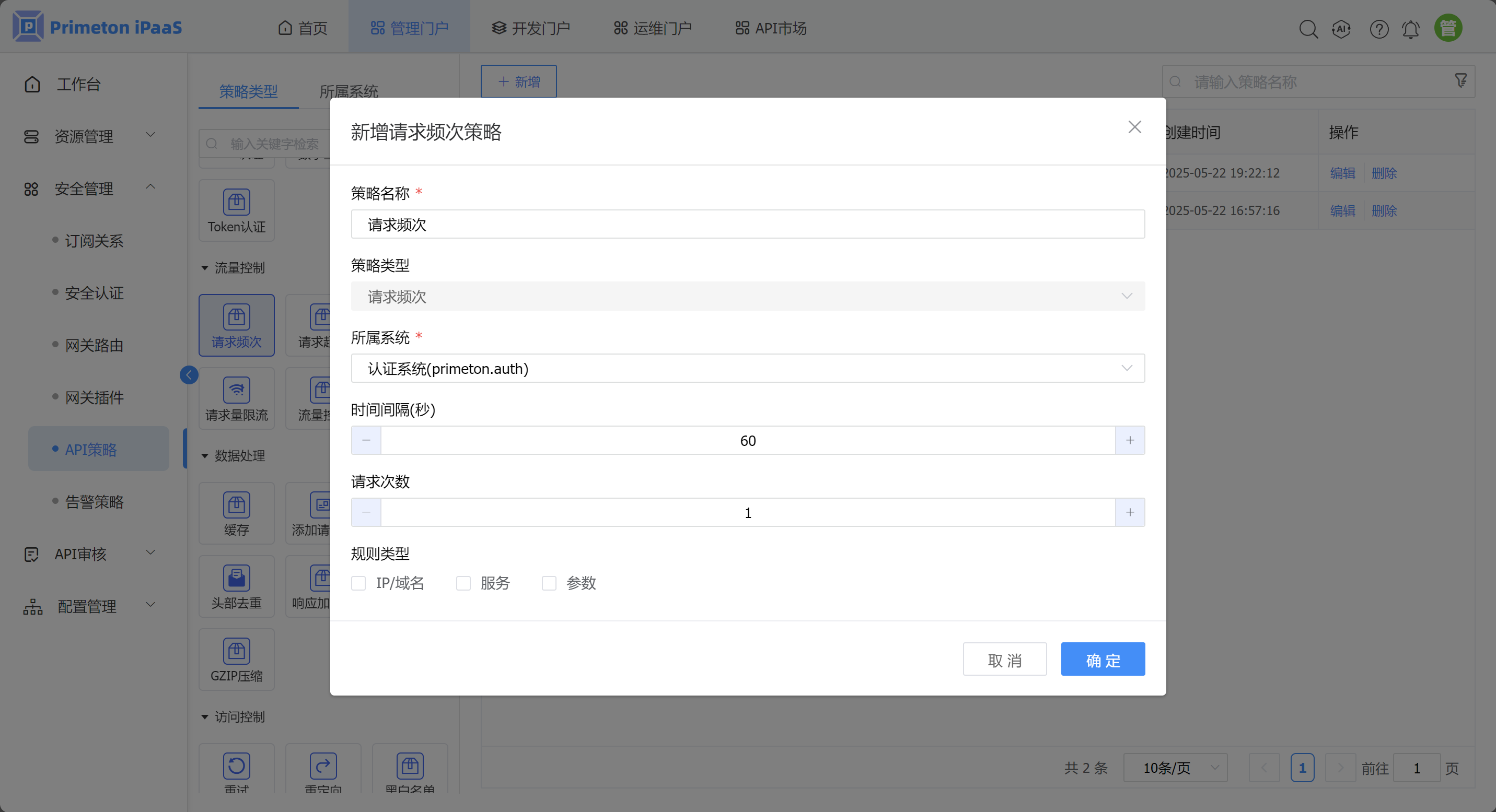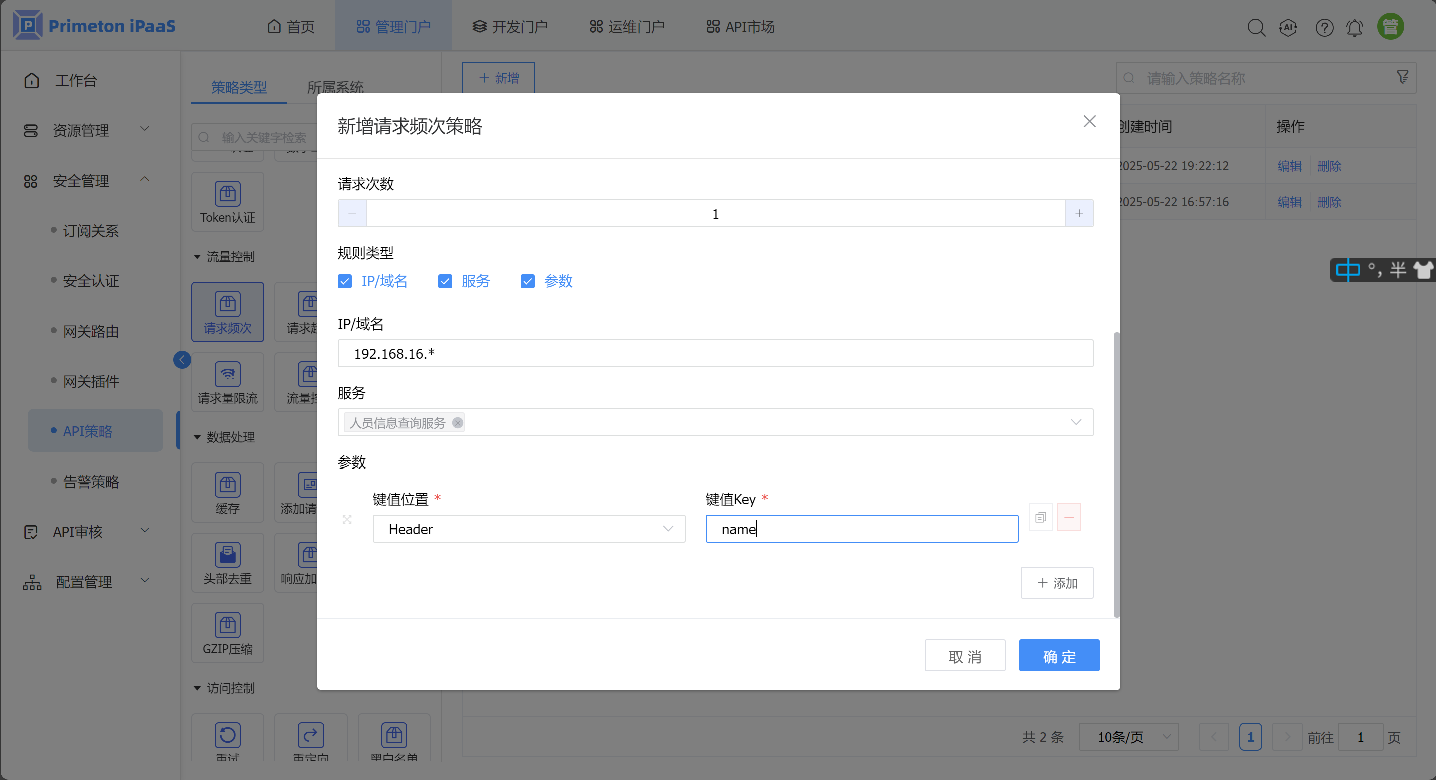 请求频次策略定义一段时间内符合条件的请求可以请求多少次,采用时间窗口限流算法,可以添加请求匹配ip、服务、Header、Query等条件进行过滤。