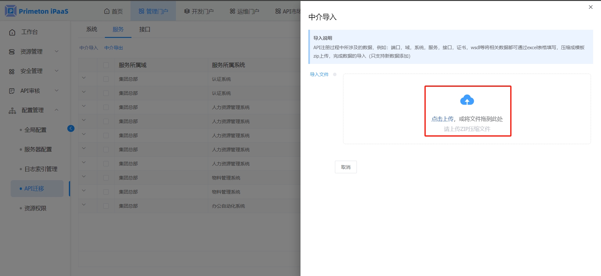 使用管理员账号登录生产环境,点击“管理门户->配置管理->API迁移”,进入API迁移页面,点击服务页签,点击“中介导入”按钮,弹出中介导入页面。